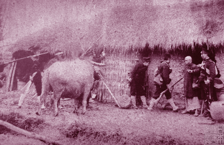 In February 1896, the Japanese army guards broke into the houses near the South Gate of Taipei to search. [Edited by Lion Art Editorial Department: “Photography Taiwan”, p. 71]