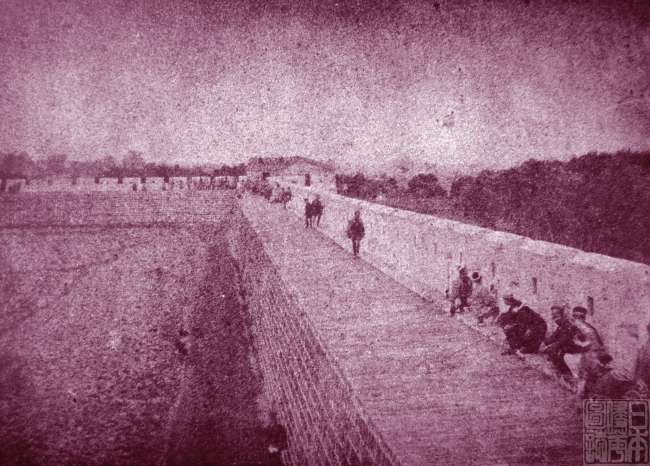 1896年元旦凌晨,台北警备队在城墙上防御抗日义军的情形。〔雄狮美术编辑部编:《摄影台湾》,台北雄狮图书股份有限公司1983年版,第70页〕