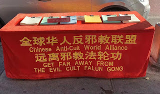 2010年以来,法轮功人员经常聚集在纽约皇后区法拉盛的人行道上,摆桌子(展台)、发传单,宣扬邪教法轮功、鼓吹“三退”,展示所谓中国虐待法轮功人员的信息,包括器官摘取的图像。“全球华人反邪教联盟”经常抗议他们的表演,称法轮功为“邪教”。