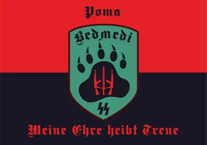 The flag of the SS Bears contains the German motto #Meine Ehre heißt Treue! (‘My honour is my loyalty!’) – which was one of the slogans of the murderous Nazi German SS troops. It was applied to the blades of specially made SS daggers and the belt buckles of SS soldiers. In addition, on the flag of the ‘Bears’ there is the official symbolism of the German Nazis – two lightning bolts representing the runes of the ‘SS’!