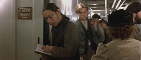 The Chinese man (premised upon one of the surviving Titanic Boiler Room Workers recorded as being named ‘Fang Lang’) is discovered floating upon a small door (or wooden panel of some kind) and speaks in the Hong Kong Cantonese dialect (such as that spoken in Bruce Lee’s film ‘Enter the Dragon’) – calling-out three tines ‘Nor Hai Li Dou Ah! (我喺呢度 – Wo Xe Ne Du)’ Or ‘I am over here!’ – with the Cantonese ‘Ah’ particle added to generate emphasis (this ‘Ah’ particle does not possess a corresponding ‘Putonghua’ ideogram). The character sounds exhausted and on the brink of collapse when rescued as his third utterance is barely audible (the Chinese actor – ‘Van Ling’ a Visual Effects Artist – provides a sterling performance). For Chinese people – this raises the heart! To see people of different ethnicities help one another as ‘equals’ is truly inspiring and something we should all aspire to!