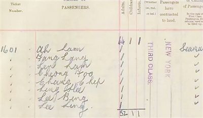 为此,唐纳德轮船公司为他们买了一张三等舱的集体票,票号为1601,价格56镑9先令11便士,登记姓名为Fang Lang、Choong Foo、Ali Lam、Ling Hee、Chang Chip、Lee Bing、Lee Ling、Len Lam。他们8人中,最小的24岁,最大的37岁。作为派遣工,他们每天要工作十几个小时,但薪水只有同样工作的白人船员的五分之一。