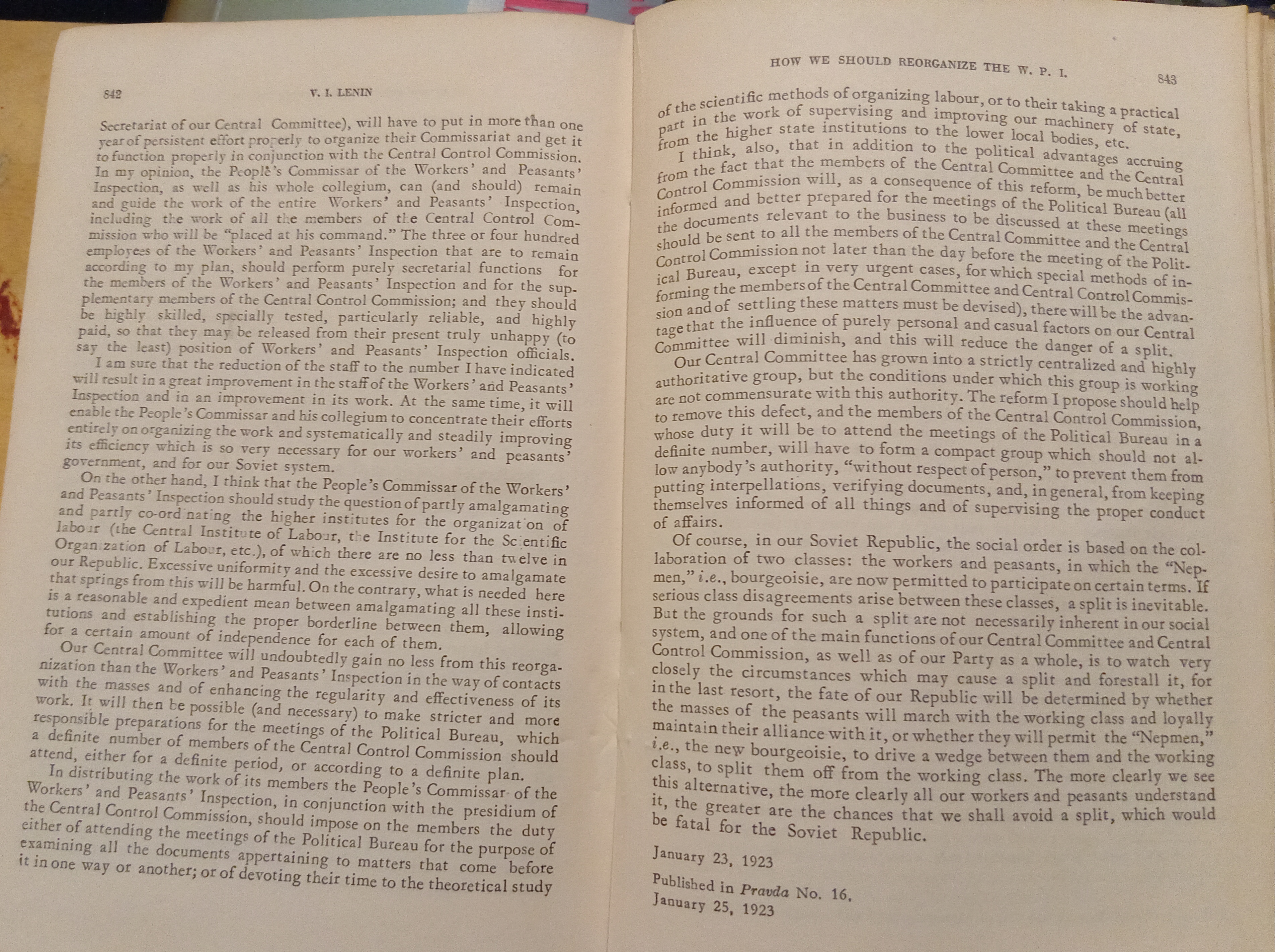 A few years ago, I acquired a Two Volume Set entitled the Essentials of VI Lenin (1947) from Comrades in the ‘New Communist Party’ (NCP) in London. The NCP was busy embracing the North Korean ideology of ‘Juche’ and were happy to jettison overt ideological works pertaining to the USSR – such as those involving Lenin and Stalin. Their loss was my gain (although a modest amount of money did change hands) and I acquired the full Stalin Collection and a very good (and quite ‘rare’) Two Volume Edition of Lenin – published at a time when the USSR was still riding high following its 1945 Victories over Naxi Germany and Imperial Japan – and before the US Cold War had fully kicked in – (falsely equating as it did the USSR with Nazi Germany). A point to remember is that the Nazi Germans (and their allies – which included the Vatican) murdered around 41 million Soviet men, women and children – far more than officially died in the ‘Holocaust’ (although at least in-part, the Nazi Germans carried-out some of the ‘Holocaust’ killings whilst occupying Soviet soil). The USSR, of course, betrayed Lenin and Stalin through the behaviour of Nikita Khrushchev in 1956 – a known coward who fled the fighting in the Ukraine during 1941 to save his own skin! The USSR as founded in 1922 must be applauded for the working-class achievement that it was, and which it remains! We must strive to keep its memory alive by correctly telling its story! Included below are what are believed to be the last two articles a very ill Lenin managed to write and publish during early 1923 (written around three-weeks to just over two-months respectively – after the successful founding of the USSR). These articles by Lenin are entitled ‘How We Should Reorganise the Workers and Peasants’ Inspection (23.1.1922) and ‘Better Fewer, But Better’ (2.3.1922). Lenin’s work tends to ‘allude’ to the USSR (that is, Lenin ‘talks around’ the subject) rather than mention it directly – so these two articles give something of the progressive (intellectual) ‘taste’ of the time within which the the USSR was founded! Onward Comrades! ACW (30.12.2022)