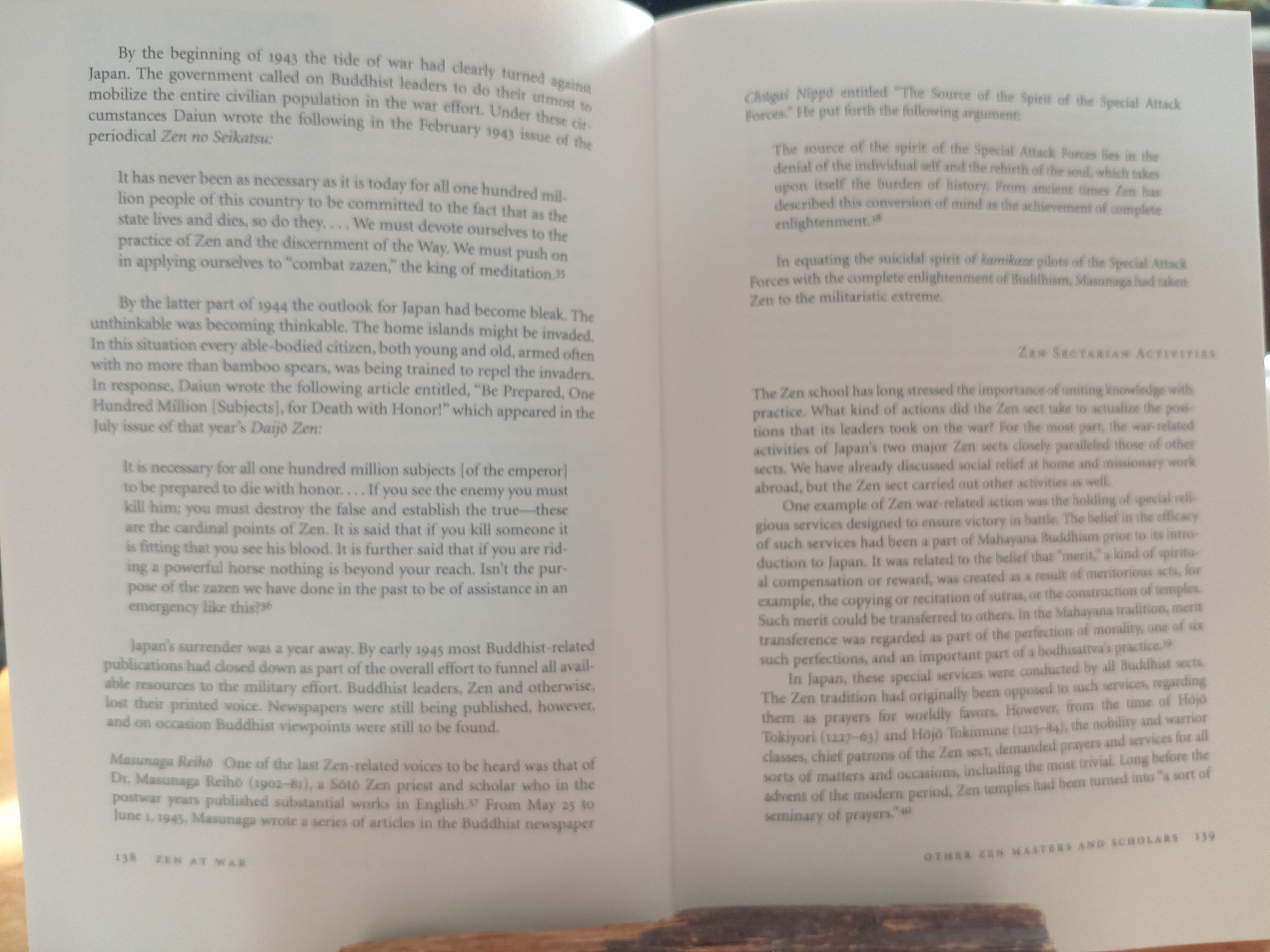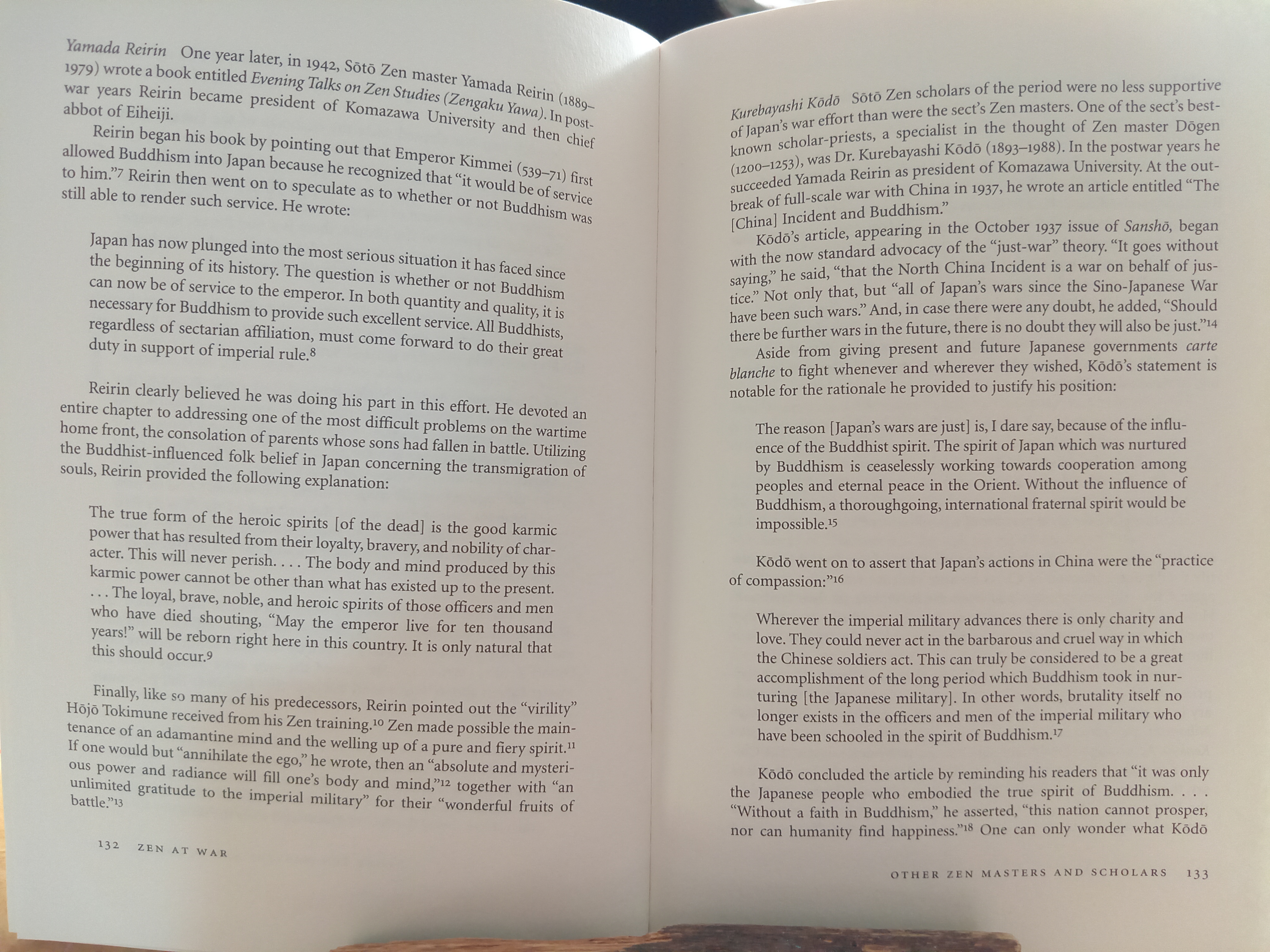 Politics conducted on the basis of a constitution are premature, and therefore fascist politics should be implemented for the next ten years… Similarly, education makes for shallow, cosmopolitan-minded persons. All of the people of this country should do Zen. That is to say, they should all awake to the Great Way of the Gods. This is Mahayana Zen.’