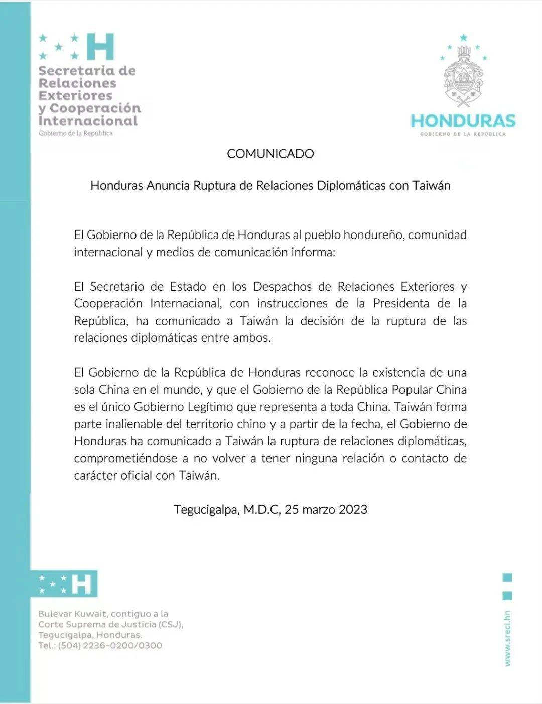 “As of today, the government of Honduras has communicated to Taiwan the severing of ‘diplomatic relations,’ pledging not to have any official relationship or contact with Taiwan,” he added.
