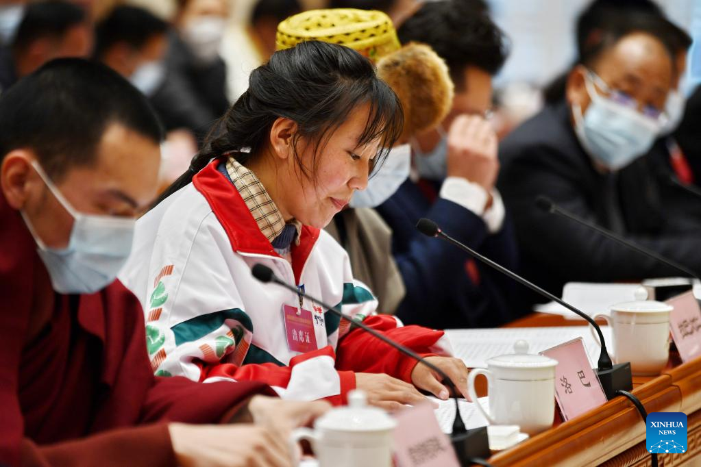 A high school student (2nd L) speaks during a symposium marking the 15th Serfs’ Emancipation Day in southwest China’s Tibet Autonomous Region, March 28, 2023. The 15th Serfs’ Emancipation Day falls on Tuesday. (Xinhua/Zhang Rufeng)