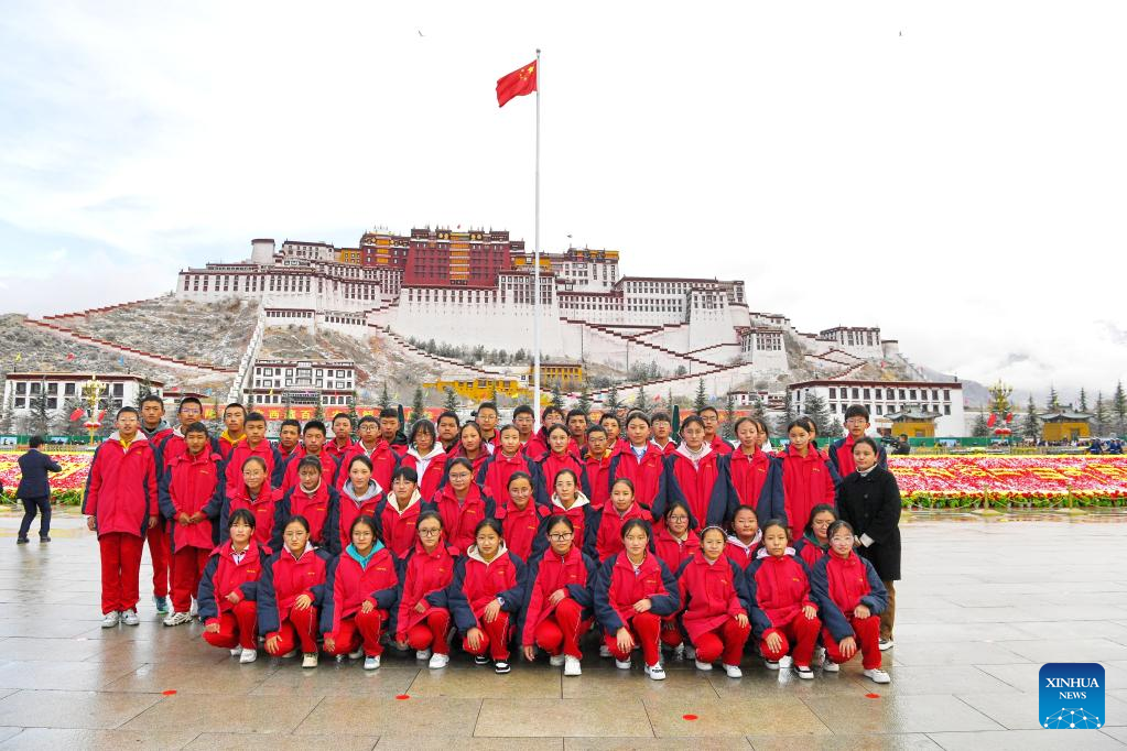 Students pose for a group photo after a national flag raising ceremony marking the 15th Serfs’ Emancipation Day at a square in front of the Potala Palace in Lhasa, capital of southwest China’s Tibet Autonomous Region, March 28, 2023. The 15th Serfs’ Emancipation Day falls on Tuesday. (Xinhua/Zhang Rufeng)