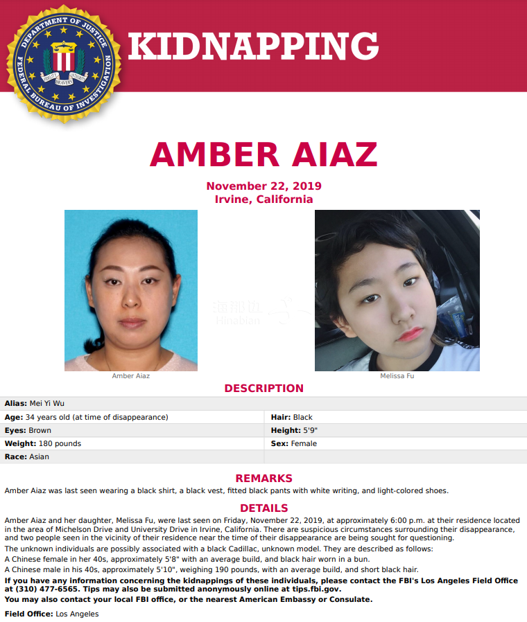 尔湾警察局周五在一份声明中表示,35岁的吴美意(Amber Aiaz)和13岁的付豪(Melissa Fu)于2019年11月22日下午6点左右,在他们位于尔湾Michelson 和 University drives的公寓中失踪。