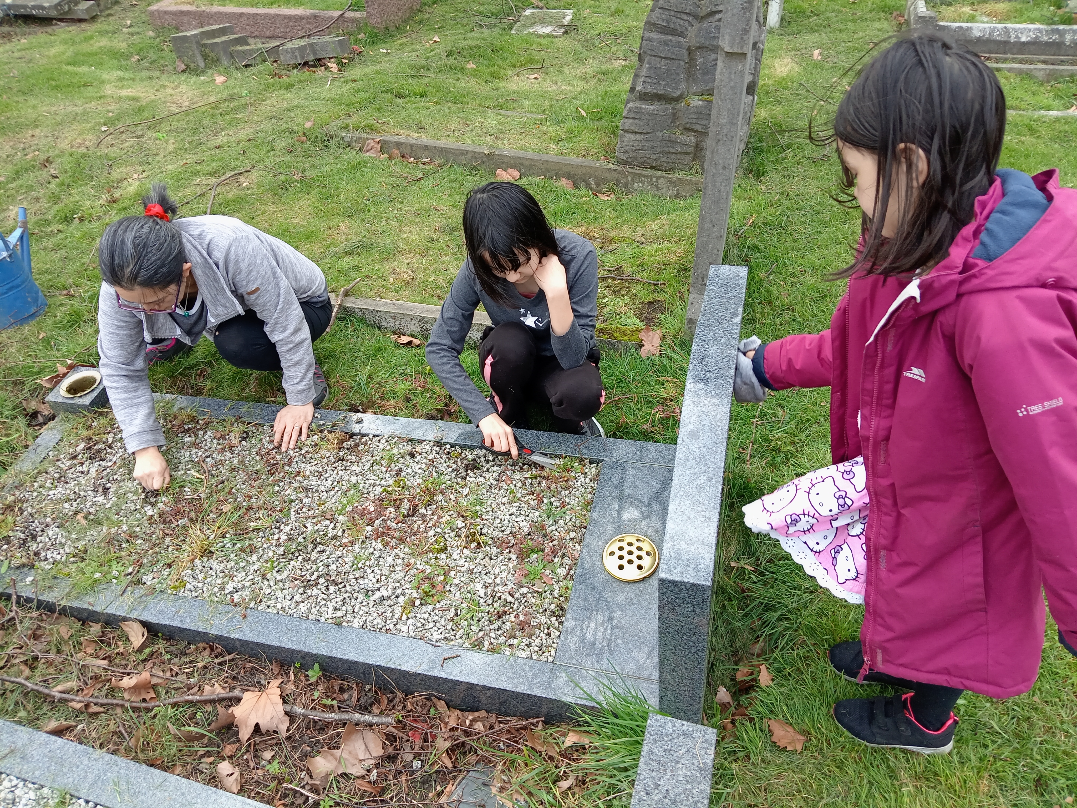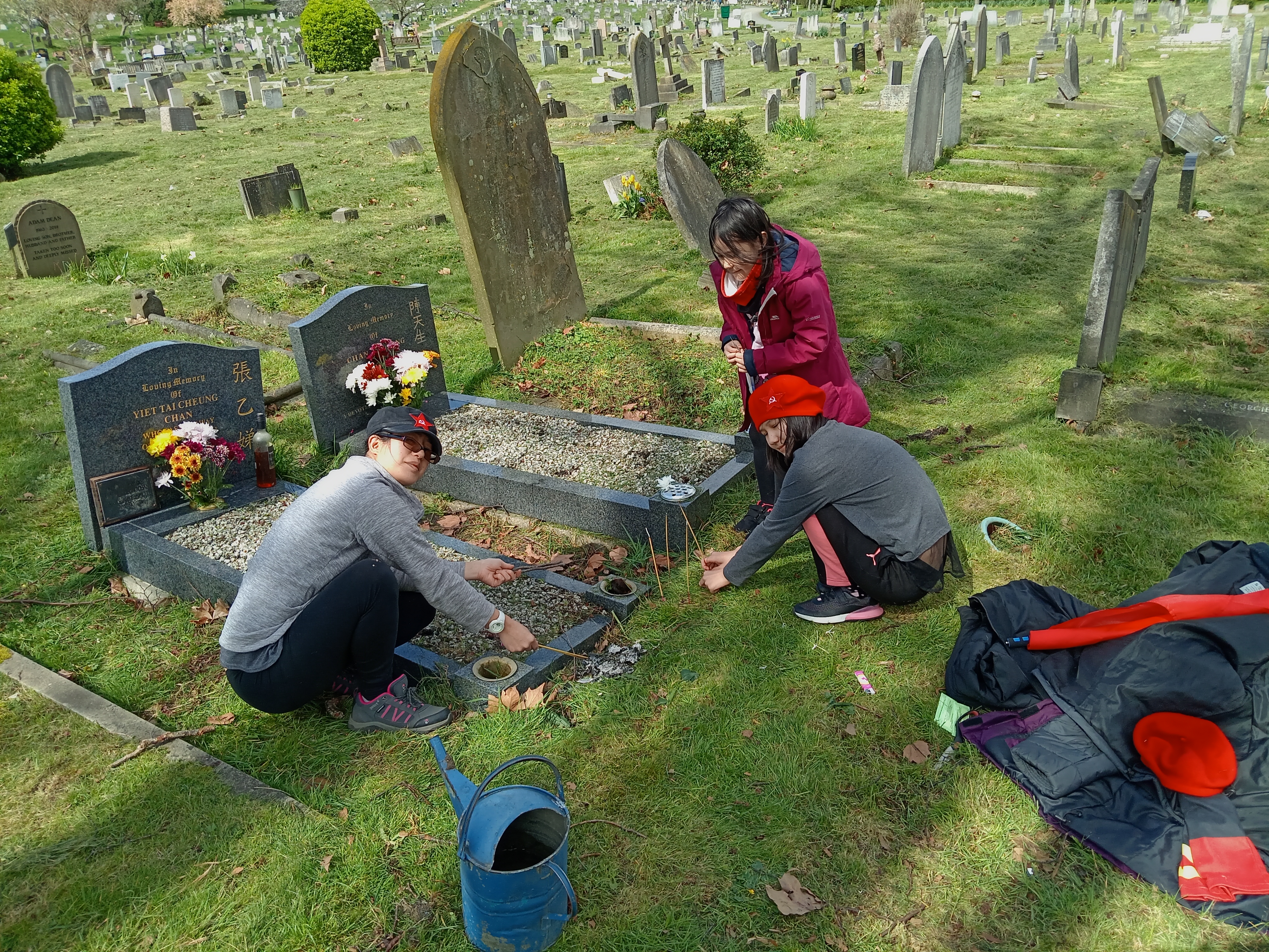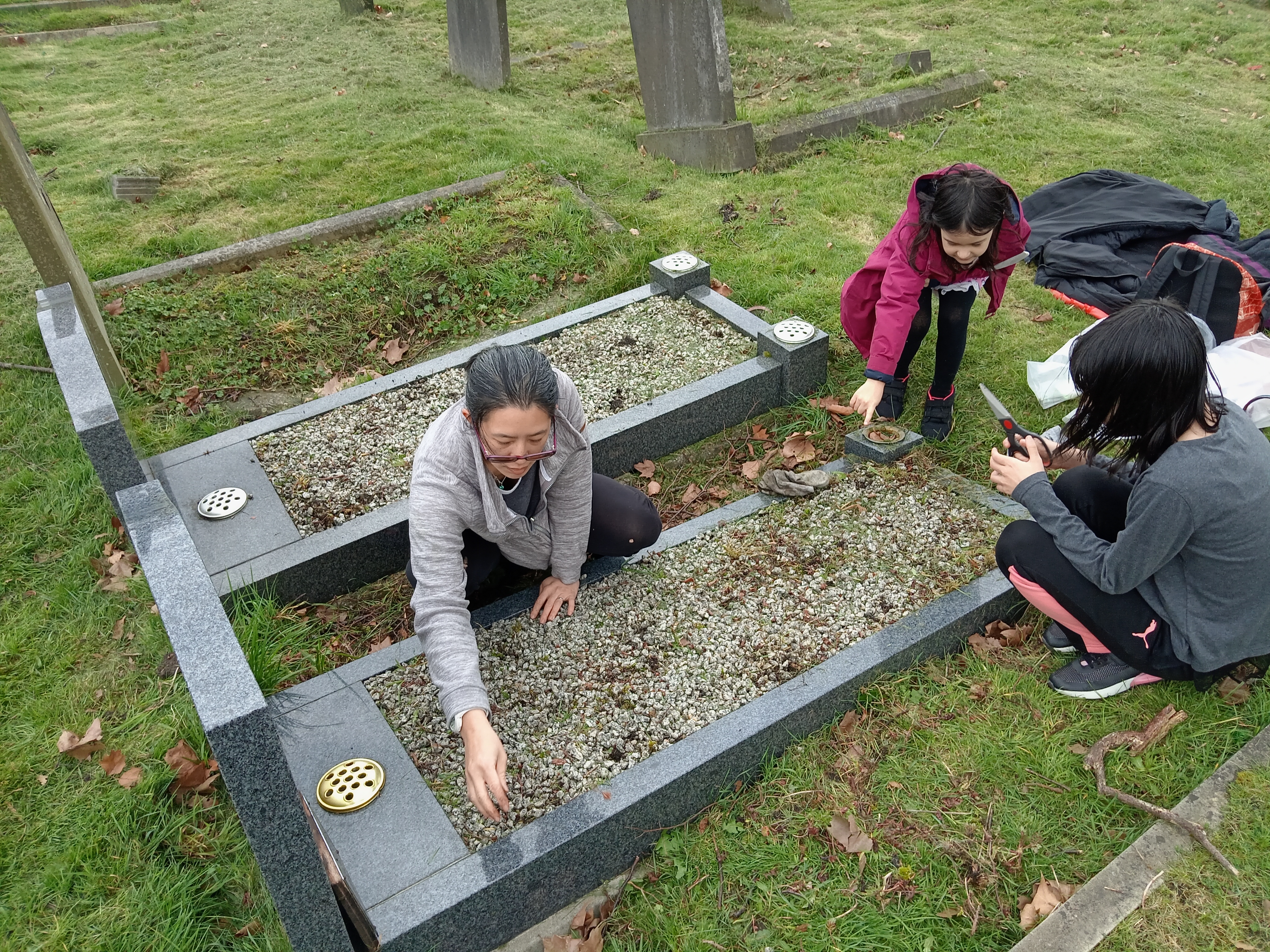 Although I am not an expert in this, I understand that some Japanese and Korean people might also follow these traditions. We clean the graves of leaves, sticks, weeds, grass and other debris whilst redistributing the gravel. We also clean and polish the marble framework of the grave stone and surroundings – removing dirt and creating a shine! We then place fresh flowers around the grave, light incense sticks and place glasses of spirit alcohol and often a lit cigarette.