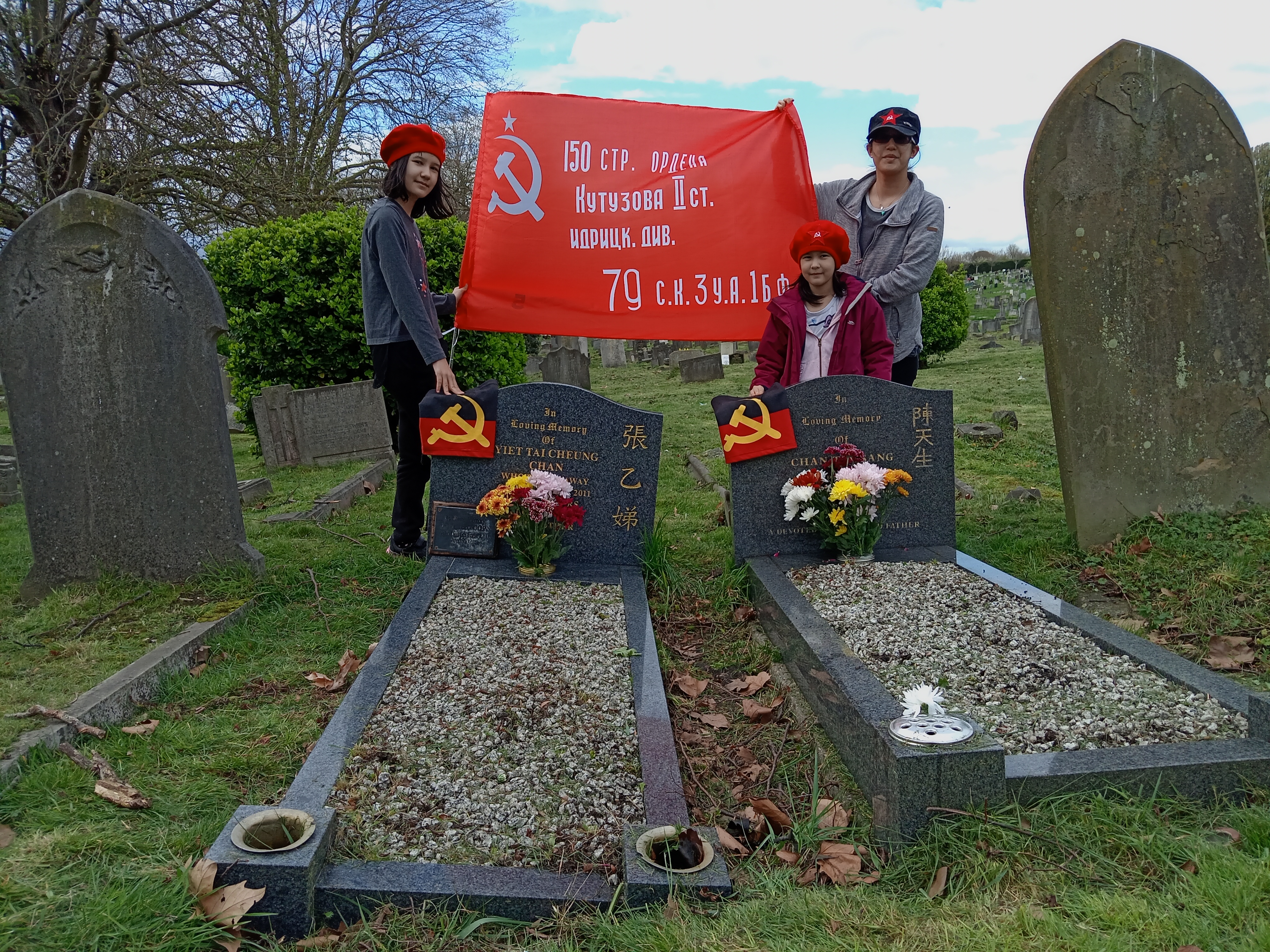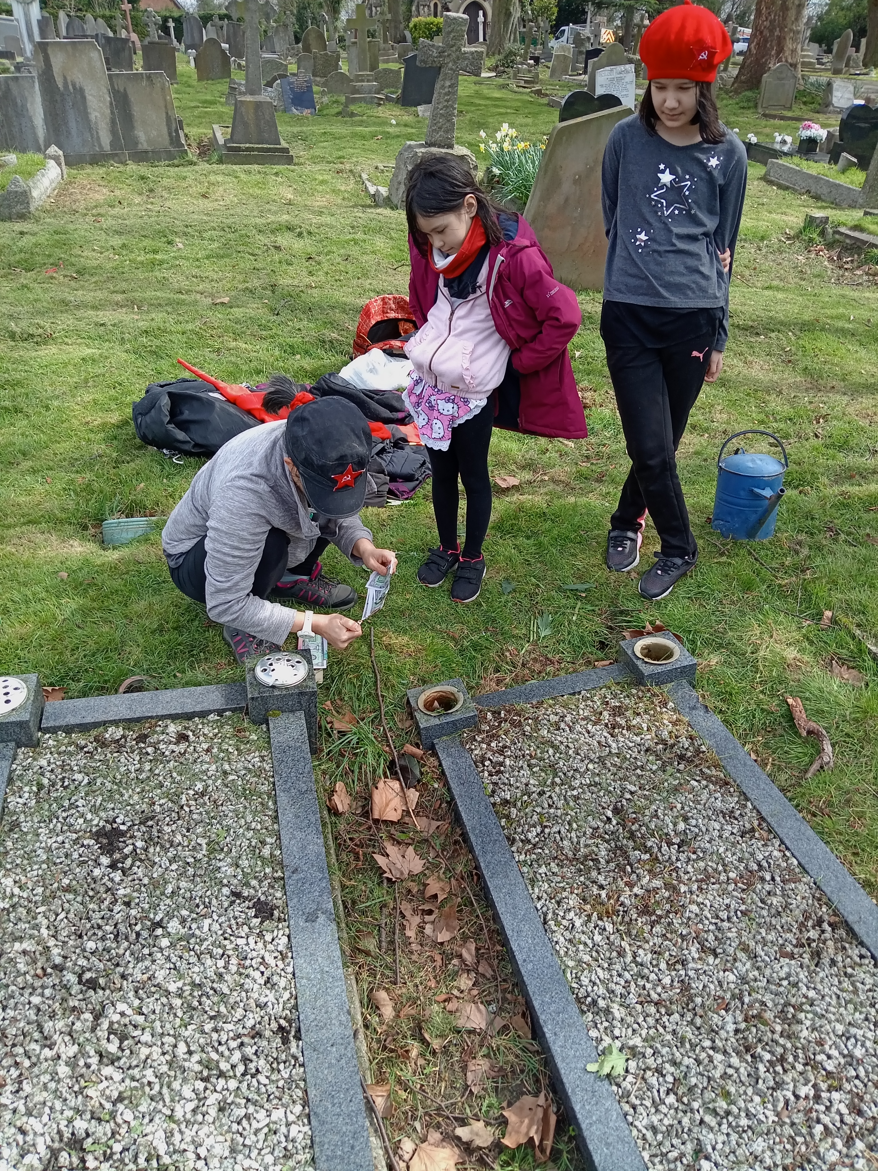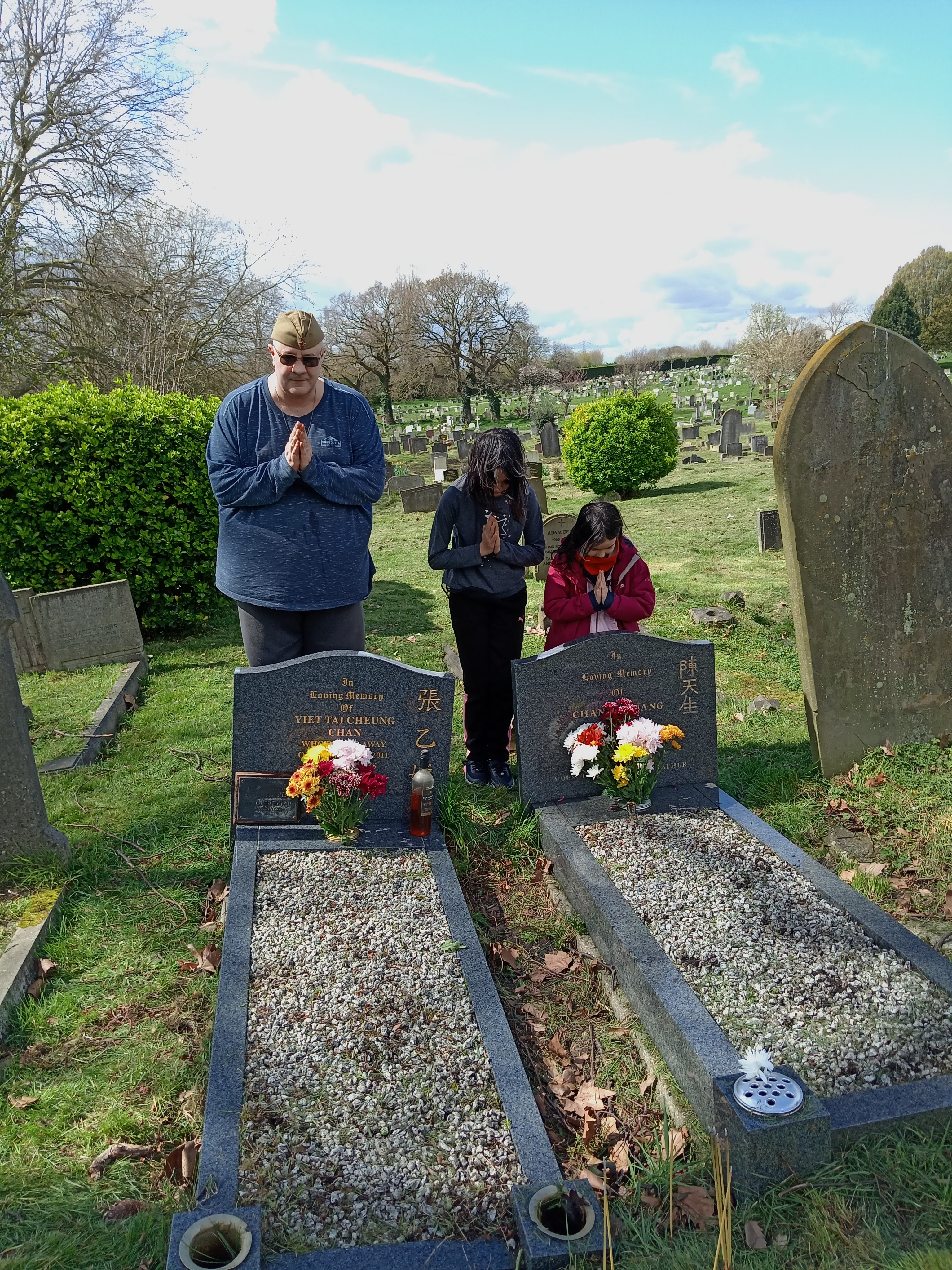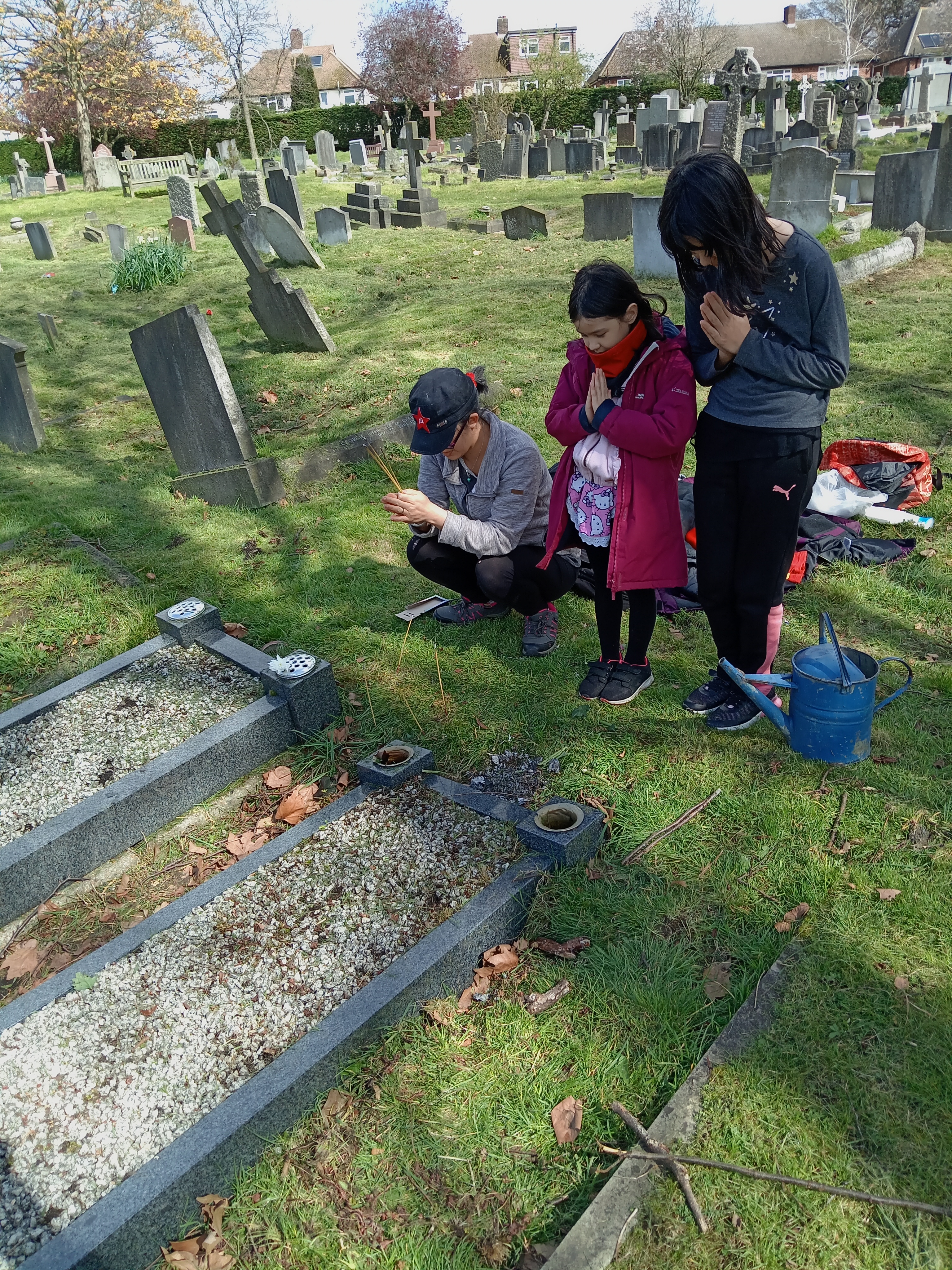 Although I am not an expert in this, I understand that some Japanese and Korean people might also follow these traditions. We clean the graves of leaves, sticks, weeds, grass and other debris whilst redistributing the gravel. We also clean and polish the marble framework of the grave stone and surroundings – removing dirt and creating a shine! We then place fresh flowers around the grave, light incense sticks and place glasses of spirit alcohol and often a lit cigarette.