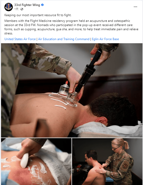 (ECNS) — The official Facebook account of the U.S. 33rd Fighter Wing at Eglin Air Force Base, Florida, on Tuesday posted photos of Traditional Chinese Medicine (TCM) therapies being applied to help treat immediate pain and relieve stress for soldiers.