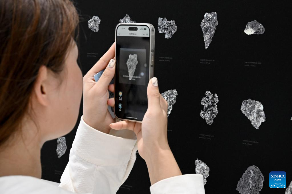 A visitor uses augmented reality (AR) technology with mobile phone at an exhibition themed on lunar soil research achievements in University of Science and Technology of China, in Hefei, east China’s Anhui Province, April 19, 2023. The exhibition starting Monday displays exhibits made by scientists, artists and engineers based on micrographs of lunar soil particles brought back by the Chang’e-5 probe.