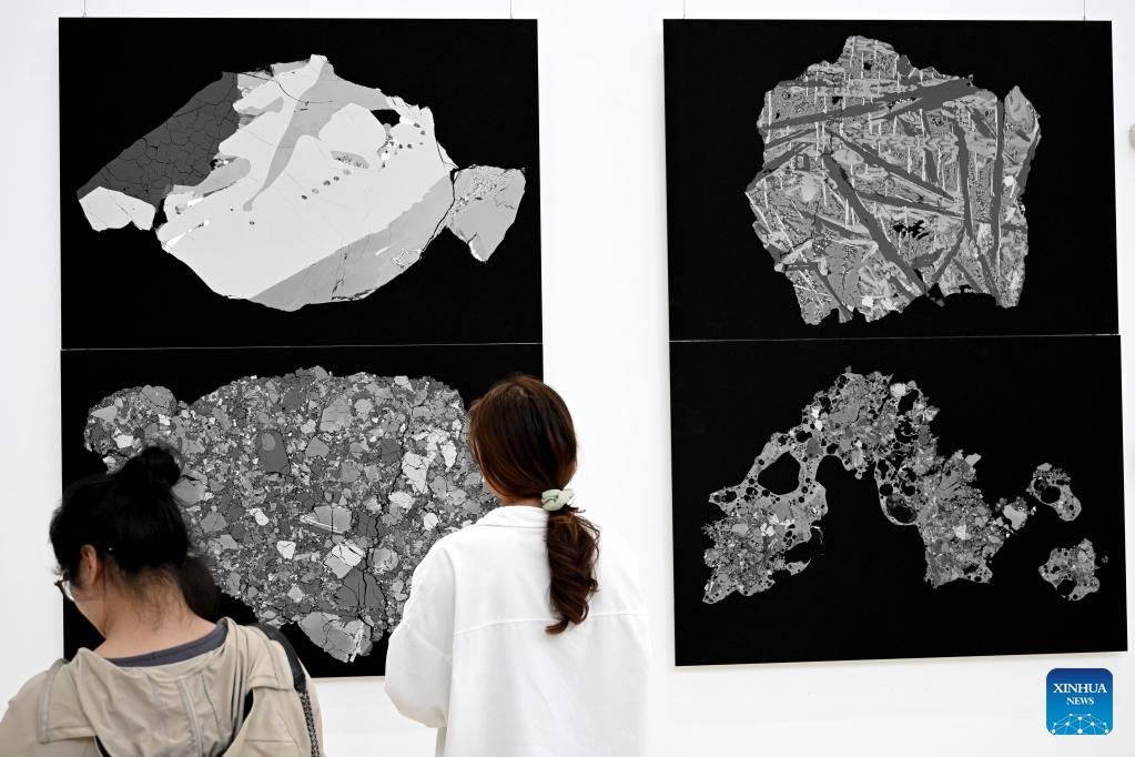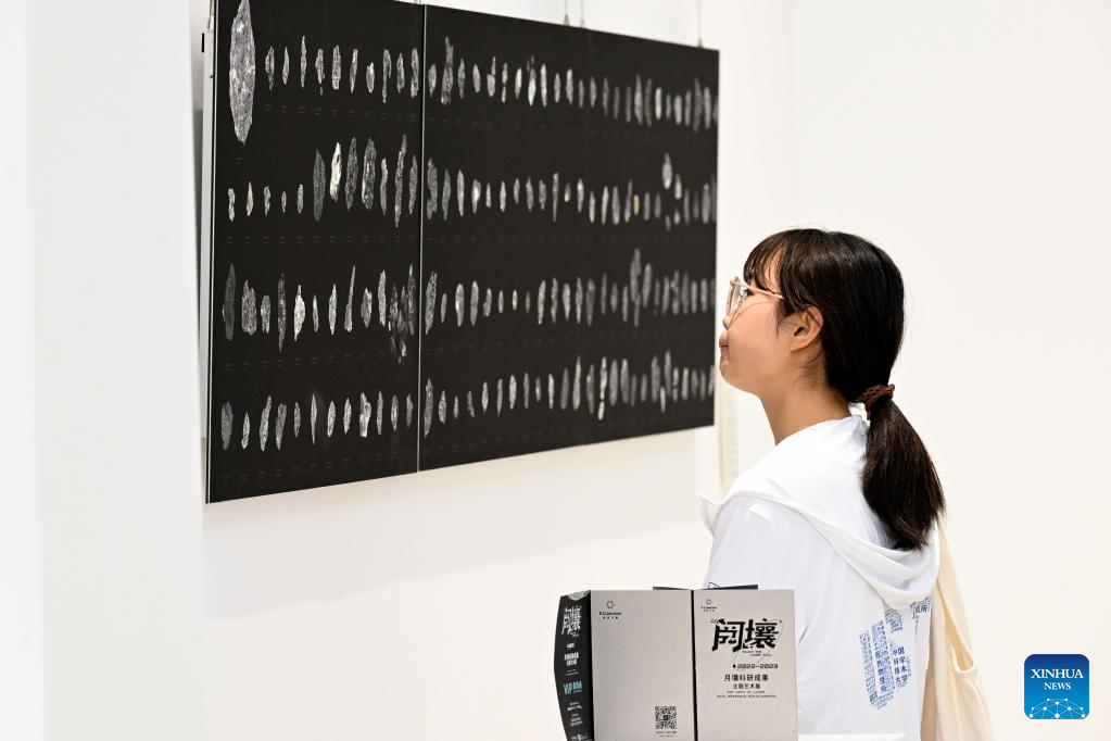 A visitor views focus stacking micrographs of lunar soil particles at an exhibition themed on lunar soil research achievements in University of Science and Technology of China, in Hefei, east China’s Anhui Province, April 19, 2023. The exhibition starting Monday displays exhibits made by scientists, artists and engineers based on micrographs of lunar soil particles brought back by the Chang’e-5 probe.
