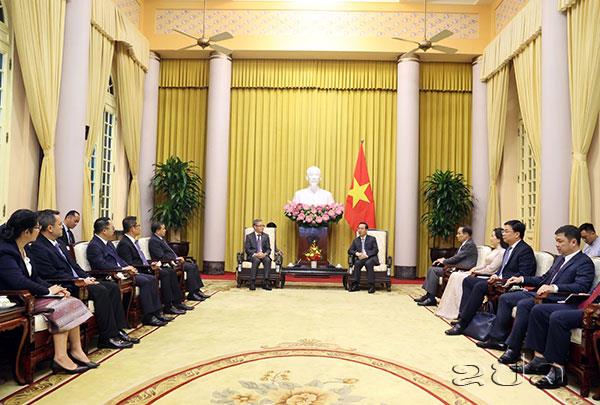 ຂປລ. ວັນທີ 20 ເມສາ 2023 ທີ່ສໍານັກງານປະທານປະເທດ ຫວຽດນາມ, ສະຫາຍ ຫວໍ ວັນ ເຖືອງ ປະທານປະເທດແຫ່ງ ສສ ຫວຽດນາມ ໄດ້ຕ້ອນຮັບການເຂົ້າຢ້ຽມຂ່ຳນັບຂອງຄະນະຜູ້ແທນ ຄະນະພົວພັນຕ່າງປະເທດສູນກາງພັກປະຊາຊົນ ປະຕິວັດລາວ ນຳໂດຍ ສະຫາຍ ທອງສະຫວັນ ພົມວິຫານ ກຳມະການສູນກາງພັກ, ຫົວໜ້າຄະນະພົວພັນຕ່າງປະເທດສູນກາງພັກປະຊາຊົນ ປະຕິວັດລາວ ໃນໂອກາດທີ່ເດີນທາງໄປຢ້ຽມຢາມ, ເຮັດວຽກ ແລະ ເຂົ້າຮ່ວມງານພົບປະມິດຕະພາບຄັ້ງທິີ X ລະຫວ່າງ ສອງຄະນະພົວພັນຕ່າງປະເທດສູນກາງພັກ ລາວ-ຫວຽດນາມ ແລະ ແຂວງເທືອທຽນເຫວ ສສ ຫວຽດນາມ.