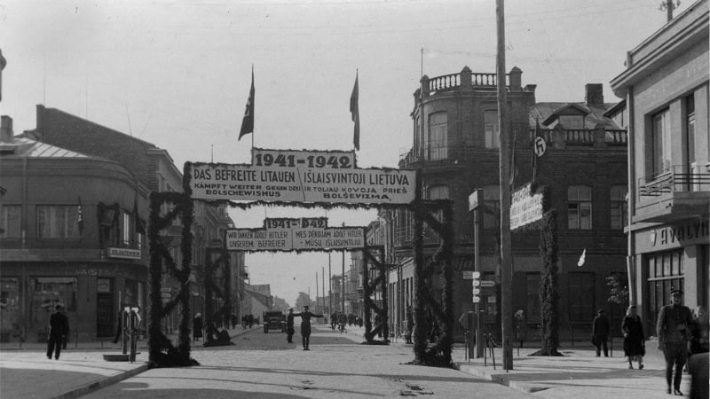 b) ‘1941-1942 – We are grateful to our liberator – Adolf Hitler!’ (Esame dėkingi mūsų išvaduotojui Adolfui Hitleriui)