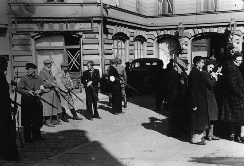 Some of these pictures show small numbers of Latvian people in ‘staged’ propaganda photographs which were designed for consumption within (domestic) Nazi German Newspapers! The German people were falsely led to believe that their (fascist) troops were ‘welcomed’ everywhere they went – with the mass-killings not shown at all! The large picture (immediately above) features representatives of the ‘Lithuanian Auxiliary Police’ – who are transporting a group of Latvian Jews (who were opposed to the Nazi German Occupation) for mass execution in Vilnius – an ‘action’ which took place during July, 1941. The top-right picture records the rounding-up of pro-Soviet Jews for mass execution by members of the ‘Latvian Auxiliary Police’ – who were operating in ‘Liepaja’ – also during July, 1941!
