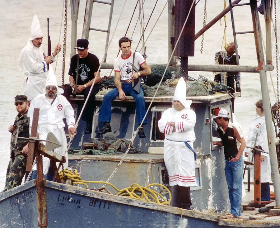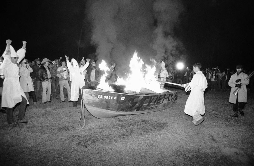 The KKK – a dangerous pseudo-White Supremacist outfit – turned-up on the shores of Galveston Bay during 1981, and whilst wearing their absurd White robes and ridiculous ‘pointed’ hoods – armed themselves with assault rifles and took to the waves to ‘attack’ the Vietnamese Boat People who were sheltering in the local harbour! Despite skirmishes, woundings and a few deaths – the US system eventually took the side of the Vietnamese people – and arrested the Knights of the Ku Klux Klan! Remember, many of these Vietnamese people were Christian converts – but found that the ‘White’ Churches of the America (the country that had destroyed their ancient country) – did NOT want them! The full story can be read at the link above!