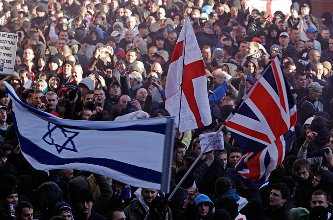 Tommy Robinson agreed stating “Wherever Europeans are not present – our general numbers lower – and all our ethnic interests are diminished!” At this point in the proceedings, the Zionist flag that was modestly covering Tommy Robinson’s private parts “slipped” to reveal a clinically “deficient” lower body structure!