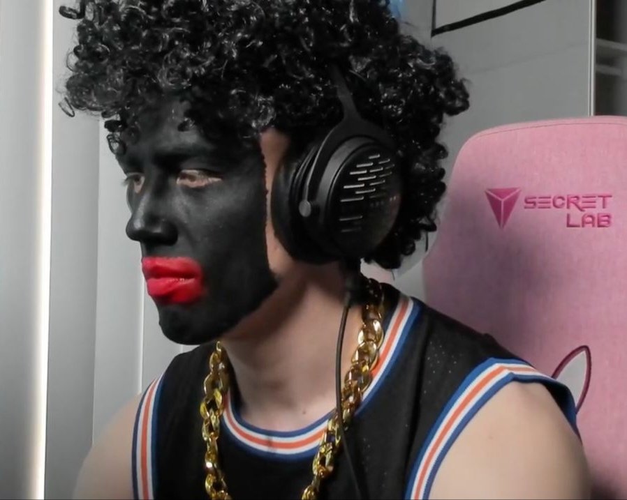 As matters stand, Tor Brookes has been openly linked to homosexuality and engaging in sex with underage ‘gamers’ (male and female). To facilitate this aspect of his ‘hooking’ young online users, Brookes usually performs ‘topless’ whilst going through his repertoire of distinct acts, different props and various impersonations. There is a buffoonish quality to the usually very poor quality of his output – but some of it remains incredibly popular amongst a certain type of young gamer. An example of a ‘hit’ is his ‘trans n’gger’ sketch aimed at demeaning the non-White and trans communities. Brookes wears blackface and sometimes a curly-haired wig. Like a trapdoor spider, Brookes lurks on the periphery of Omegle for the unsuspecting to meander into his presence. He sits and he patiently waits… As he knows the power of the shock he is about to unleash. Whilst mimicking a Black American accent – Brookes announces, ‘What’s good with it n’gger!’ and ‘I is a trans n’gger’ – explaining ‘I wasn’t born the race that I is!’ He further announces ‘We’re gonna defund the Police!’ and ‘R’pe all the White women!’ and so on. He is expressing what the far-right considers to be the illogical and unnatural position of transgender thinking by integrating trans-thinking with Black Civil Rights and Black identity politics! If a man or a woman can ‘imagine’ that they are the opposite sex to the biological reality that their bodies represent (and any number of similar variations, negations or assertions) – then why is it that a person born in a White body cannot ‘choose’ to interpret their existence as being that of a ‘Black’ person?