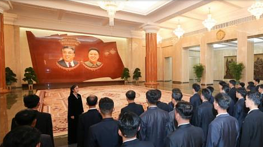 위대한 우리 당, 우리 공화국의 창건자, 건설자이시며 사회주의조선의 거룩한 영상이신 위대한 수령 김일성동지와 위대한 령도자 김정일동지께서 영생의 모습으로 계시는 금수산태양궁전은 숭엄한 분위기에 휩싸여있었다.