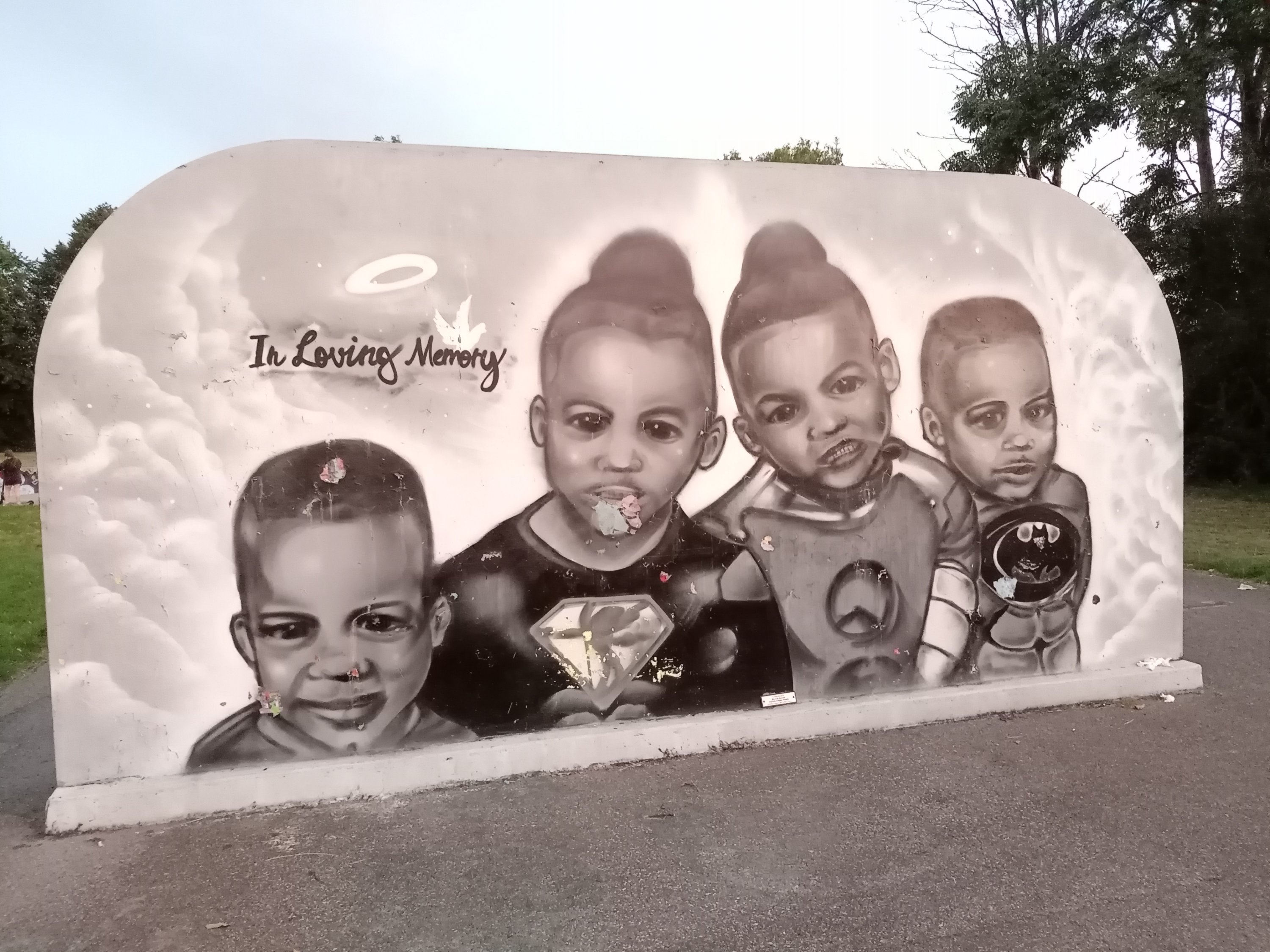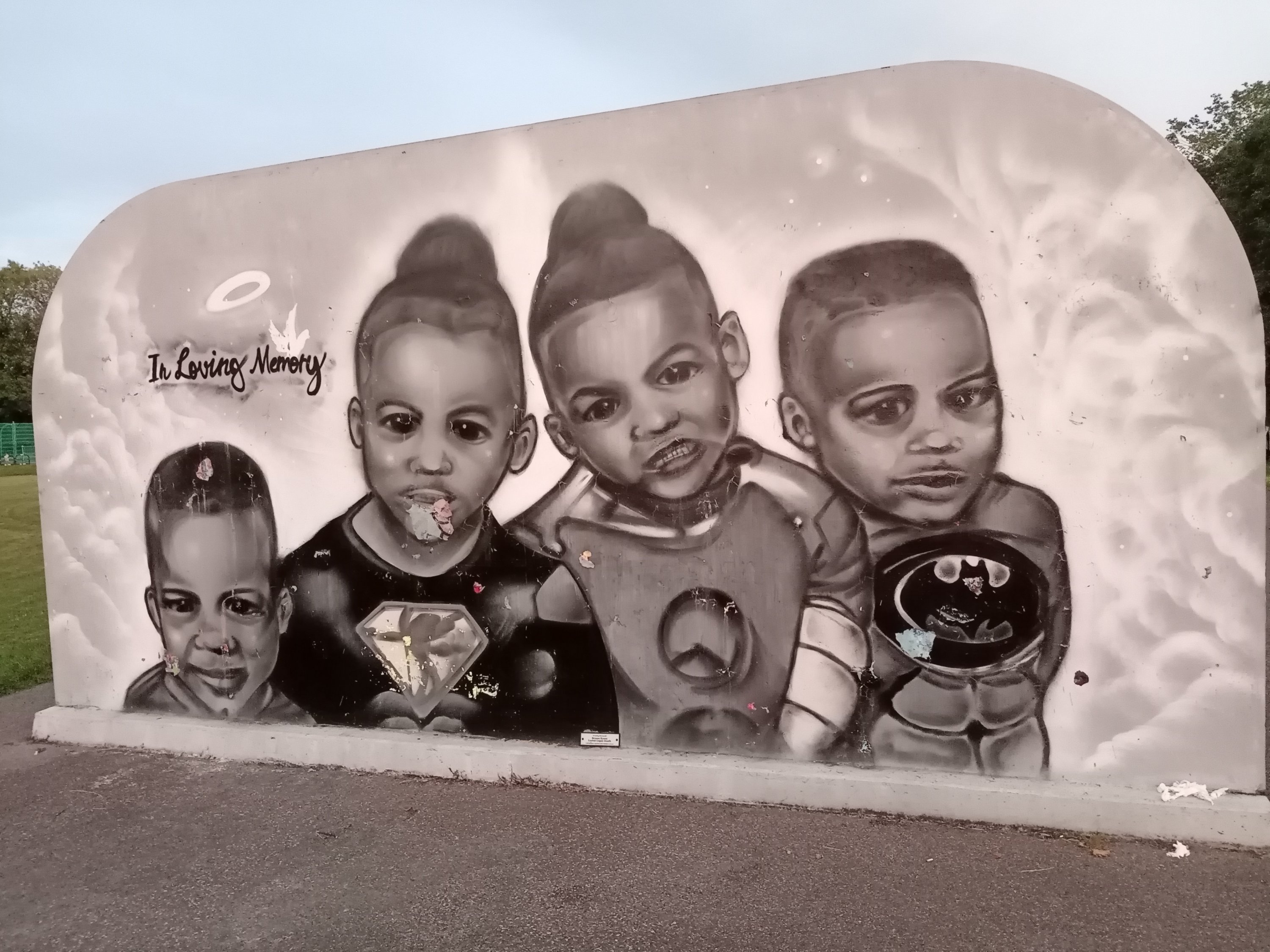 This mural was painted on the reverse side of a skateboarding ramp in the Skateboarding Park of Collingwood Recreation Ground – Sutton. This is a separate section to the park itself situated next to the Borough Ground of Sutton United Football Team. These four young children (two sets of twins aged ‘3’ and ‘4’ respectively) died in a fire shortly after 7pm on December 16th, 2021. Their mother (Deveca Rose) – an NHS worker – had gone to a nearby Supermarket whilst the children slept to purchase supplies when faulty wiring in a set of fairy lights erupted into a sudden and intense blaze around the front door and upstairs bedroom where the children were sleeping.