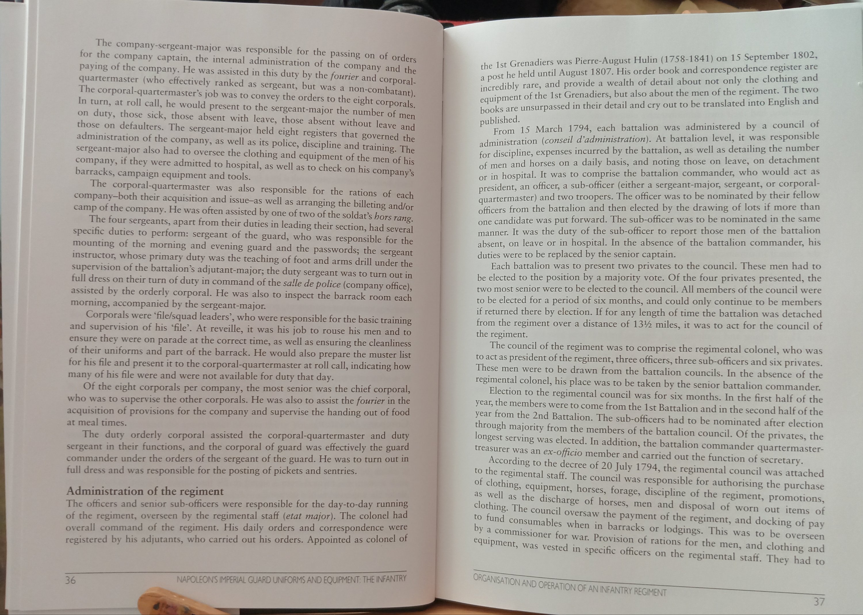 In Paul L Dawson’s book entitled ‘Napoleon’s Imperial Guard – Uniforms and Equipment – The Infantry’ – a very interesting page (number 37 – see above) describes the so-called ‘conseil d’administration’ (Council of Administrators) or ‘Governing Body’ – an administrative body which demonstrates the ‘Socialist’ and ‘egalitarian’ underpinnings of the French ‘Republic’! Every man ‘elected’ to this body – regardless of rank and including ‘Private’ soldiers – were absolutely ‘equal’ whilst attending the meetings pertaining to the functioning of this administrative body. Although the French Army (‘Grande Armee’) – and particularly the ‘Imperial Guard’ – functioned due to a strict hierarchy of rank and file, when operating as a member of this ‘Council’ ALL words of all men were considered to be of equal worth and value!