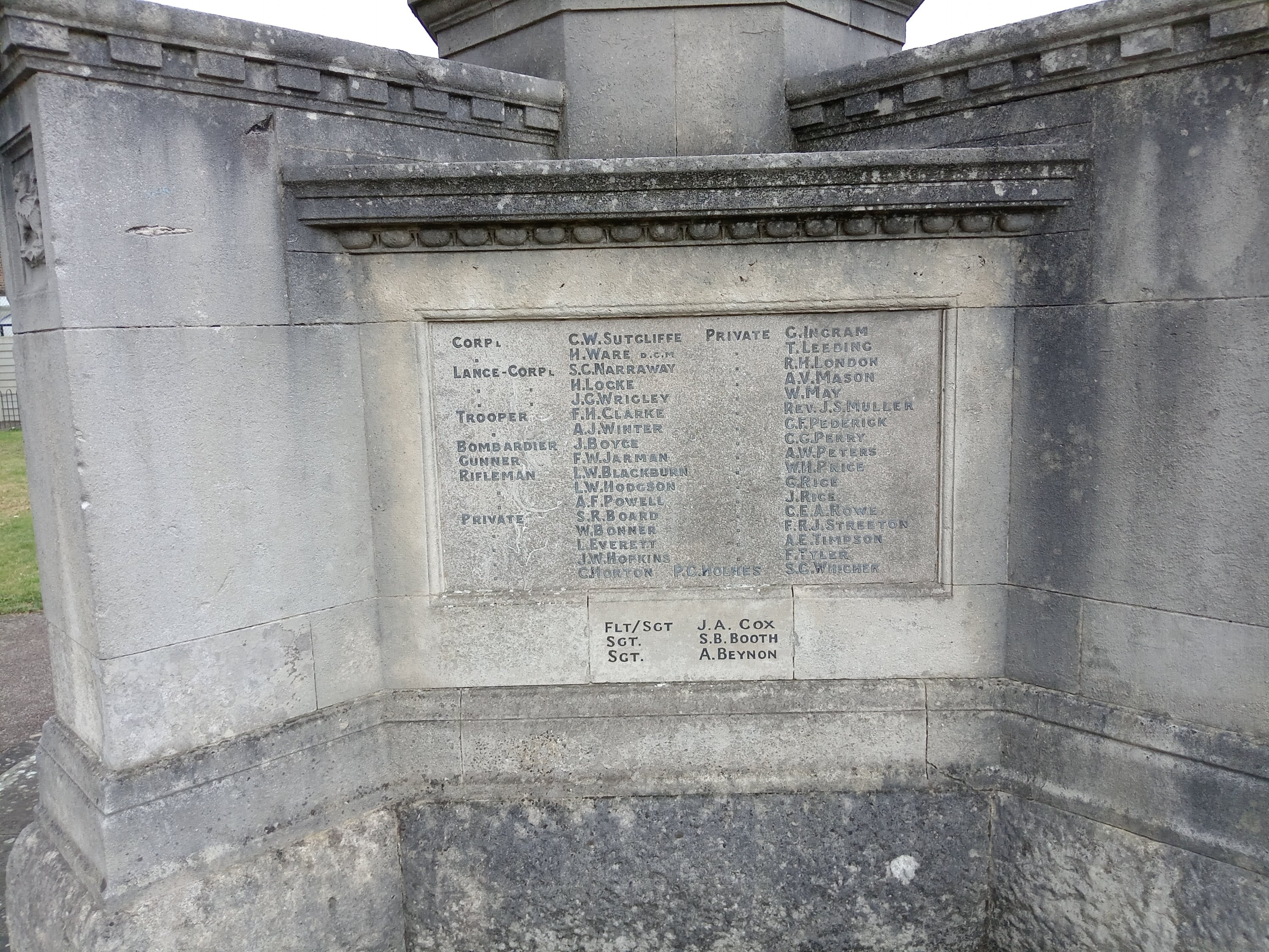 First World War memorial, designed by C J Marshall and unveiled on 16 March 1921, with further names added after the Second World War.
