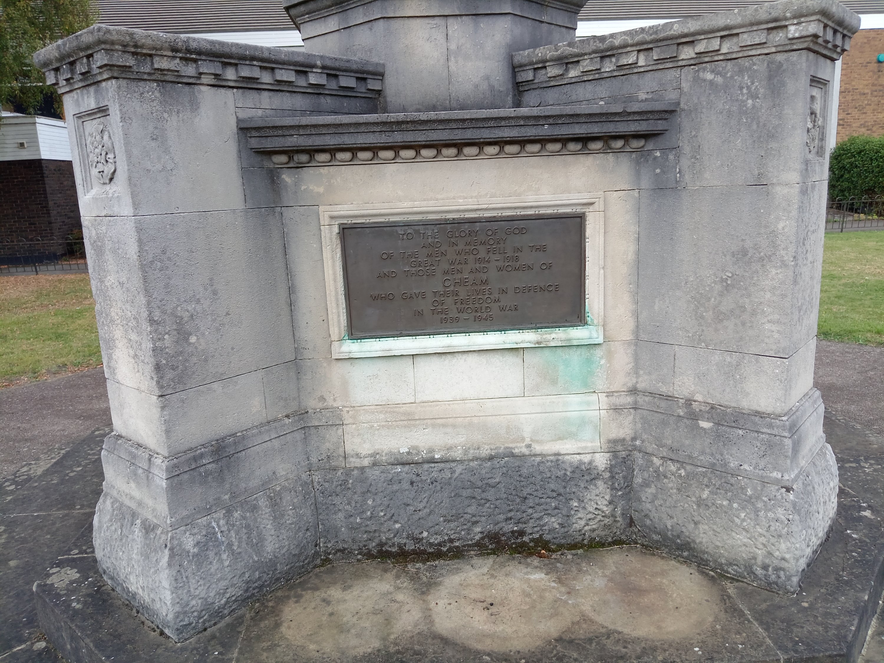 The front face of the plinth facing Malden Road carries a recessed panel of Hopton Wood marble which is inscribed with: TO THE GLORY OF GOD/ AND IN MEMORY/ OF THE MEN OF CHEAM WHO LAID DOWN THEIR LIVES IN THE GREAT WAR, 1914-1918. This has since been covered with a bronze plaque which carries the inscription: TO THE GLORY OF GOD/ AND IN MEMORY/ OF THE MEN WHO FELL IN THE/ GREAT WAR 1914 – 1918/ AND THOSE MEN AND WOMEN OF/ CHEAM/ WHO GAVE THEIR LIVES IN DEFENCE/ OF FREEDOM/ IN THE WORLD WAR/ 1939 – 1945.