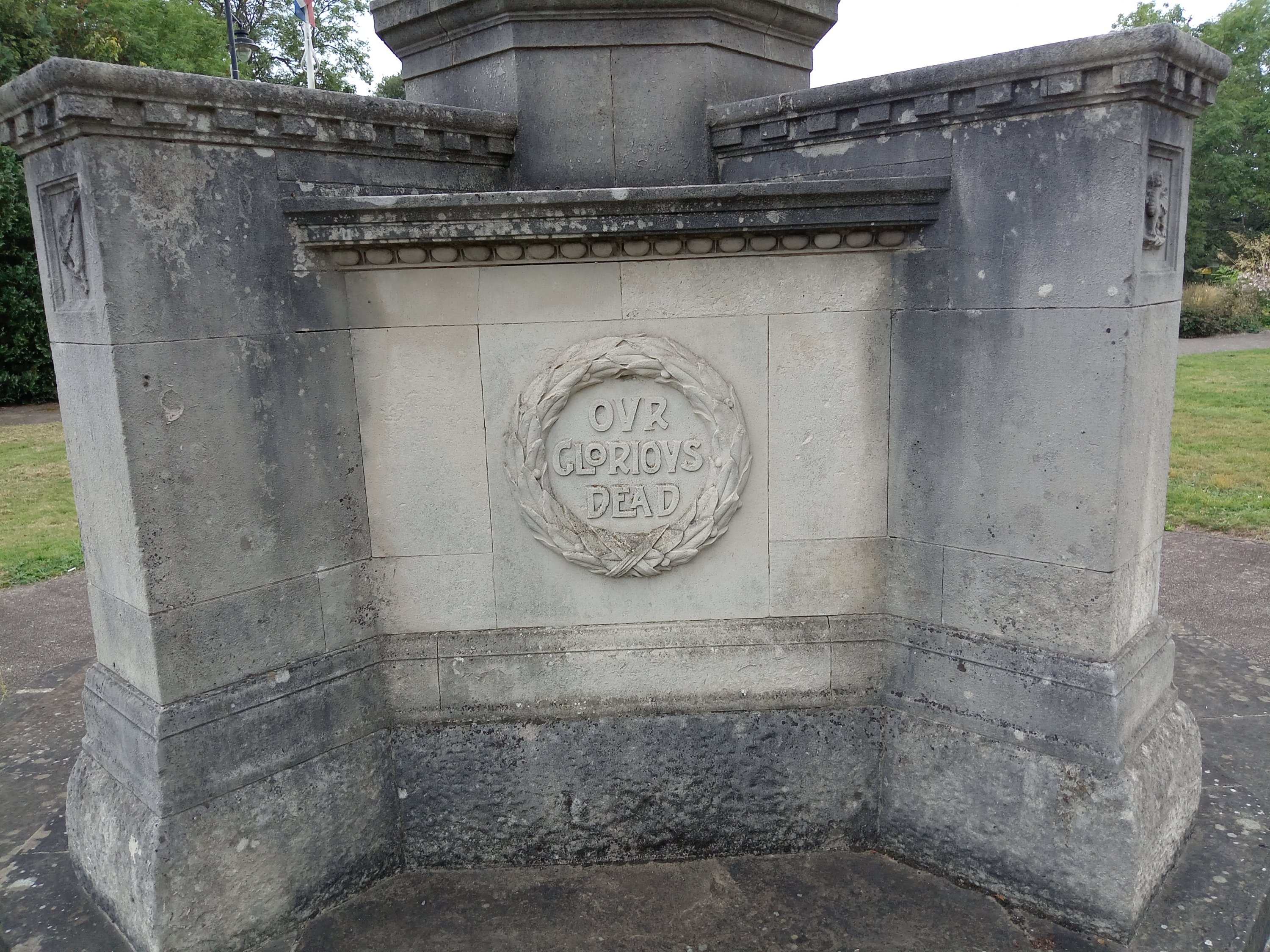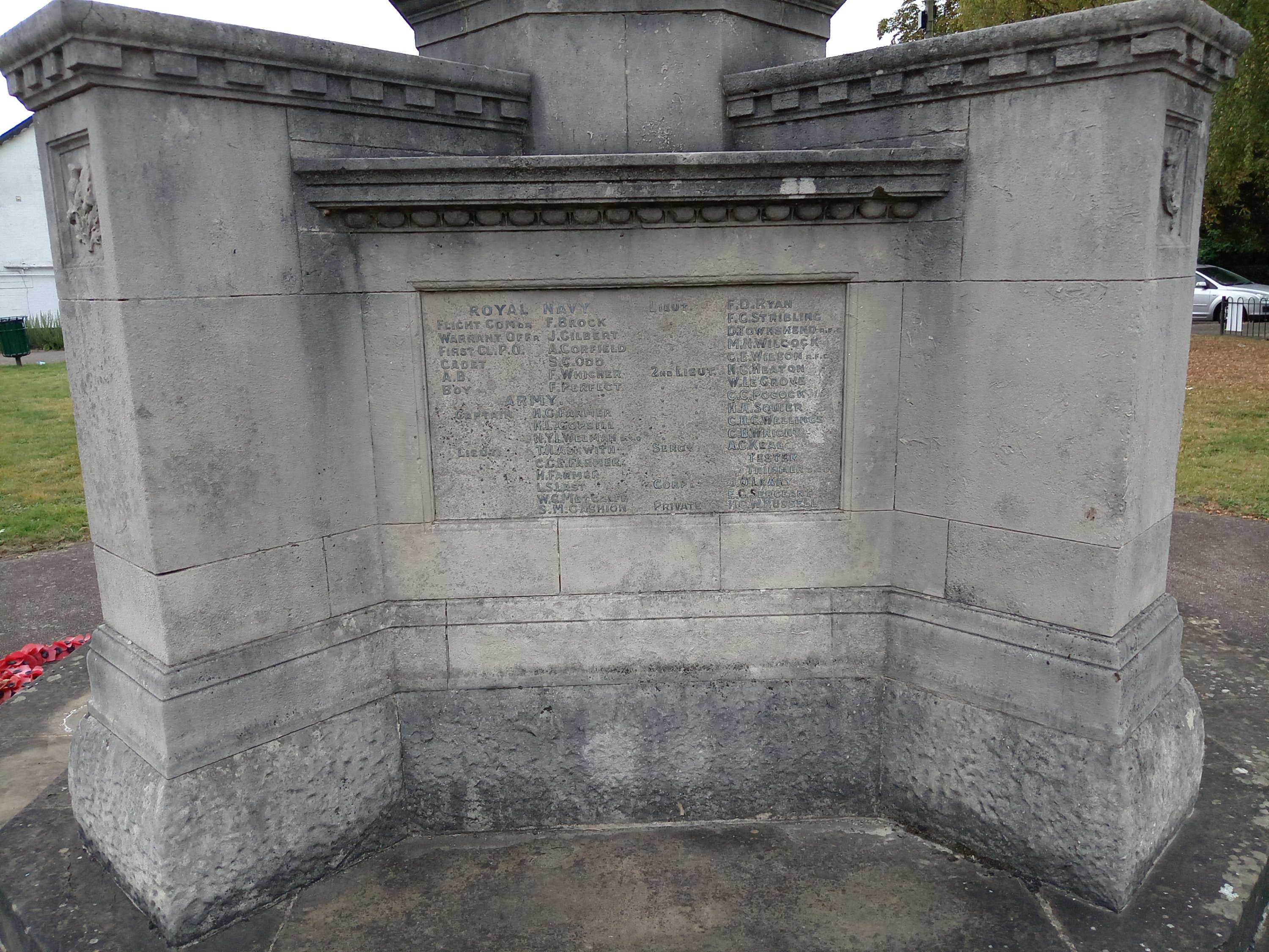 At the sides are similar marble panels with leaded letters which carry the names of the fallen which number 67 under the headings Royal Navy and Army. Three more names have been added underneath the panel. The back of the plinth bears a laurel wreath enclosing the words OUR GLORIOUS DEAD in raised letters.