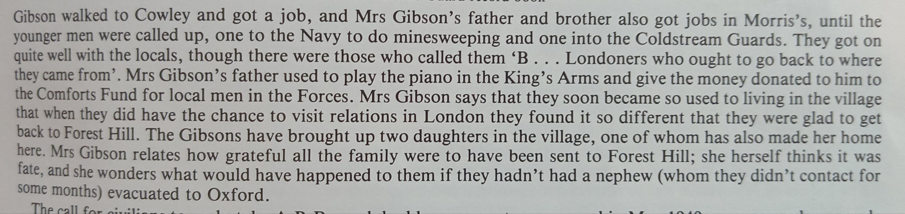 My maternal (‘Gibson’) family used to live in Lewisham, East London – until they were bombed-out by Hitler during the Blitz of September 1940 (the Blitz would go on to kill 70,000 British people between 1940-1941 – with 40,000 deaths in London alone). The Gibson family were then evacuated to the ‘Forest Hill’ area of Oxfordshire – due to them having a ‘nephew’ living in the area. In 1983, a book focusing on local history was commissioned entitled ‘Forest Hill with Shotover – A Portrait (1983)’. This was published by the ‘Forest Hill Women’s Association’. The Story of my grandfather – Arthur Gibson – and his family arriving in the area is recorded on Pages 28-29: