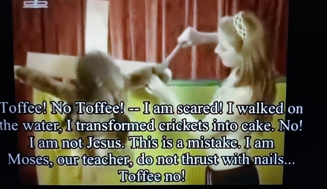 “Toffee and the Gorilla” is an Israeli TV show starring Israeli actress Dawn Rosenzweig as Toffee. The show was titled “The History Programme of Toffee the Gorilla.” Israeli writer Roy Arad was a scriptwriter for the show, which appears to have aired in 2007 (iakn.us/2GCrjwF). While this show may be surprising to many Americans, there is a long precedent for such anti-Christians views. A book published by Princeton University Press, “Jesus in the Talmud” by scholar Peter Schafer, details the Talmudic passages about Jesus. See iakn.us/2SSZIMh (archived at iakn.us/2GCk5bE). Another Toffee show makes fun of the United States (which gives Israel over $10 million per day).