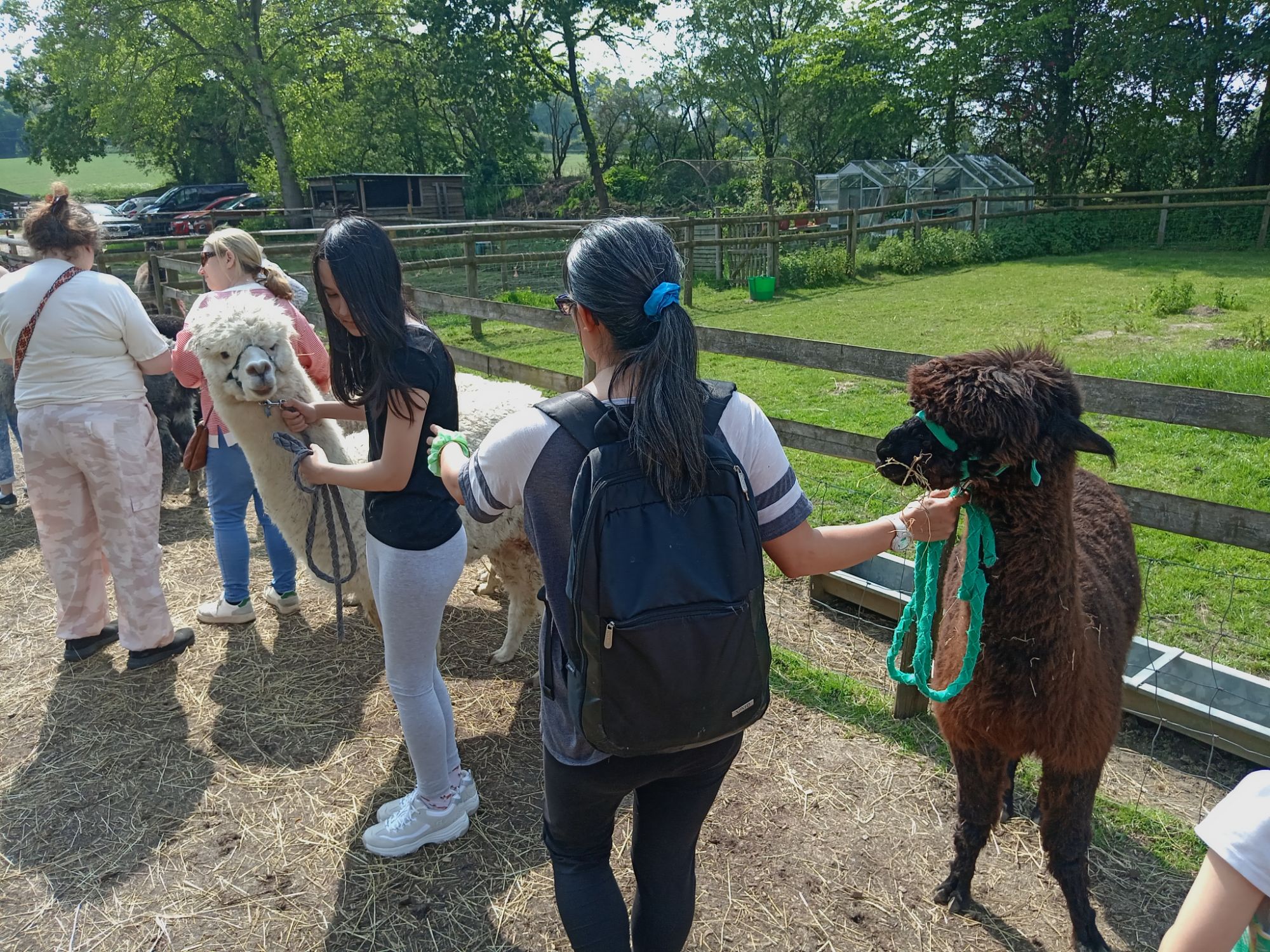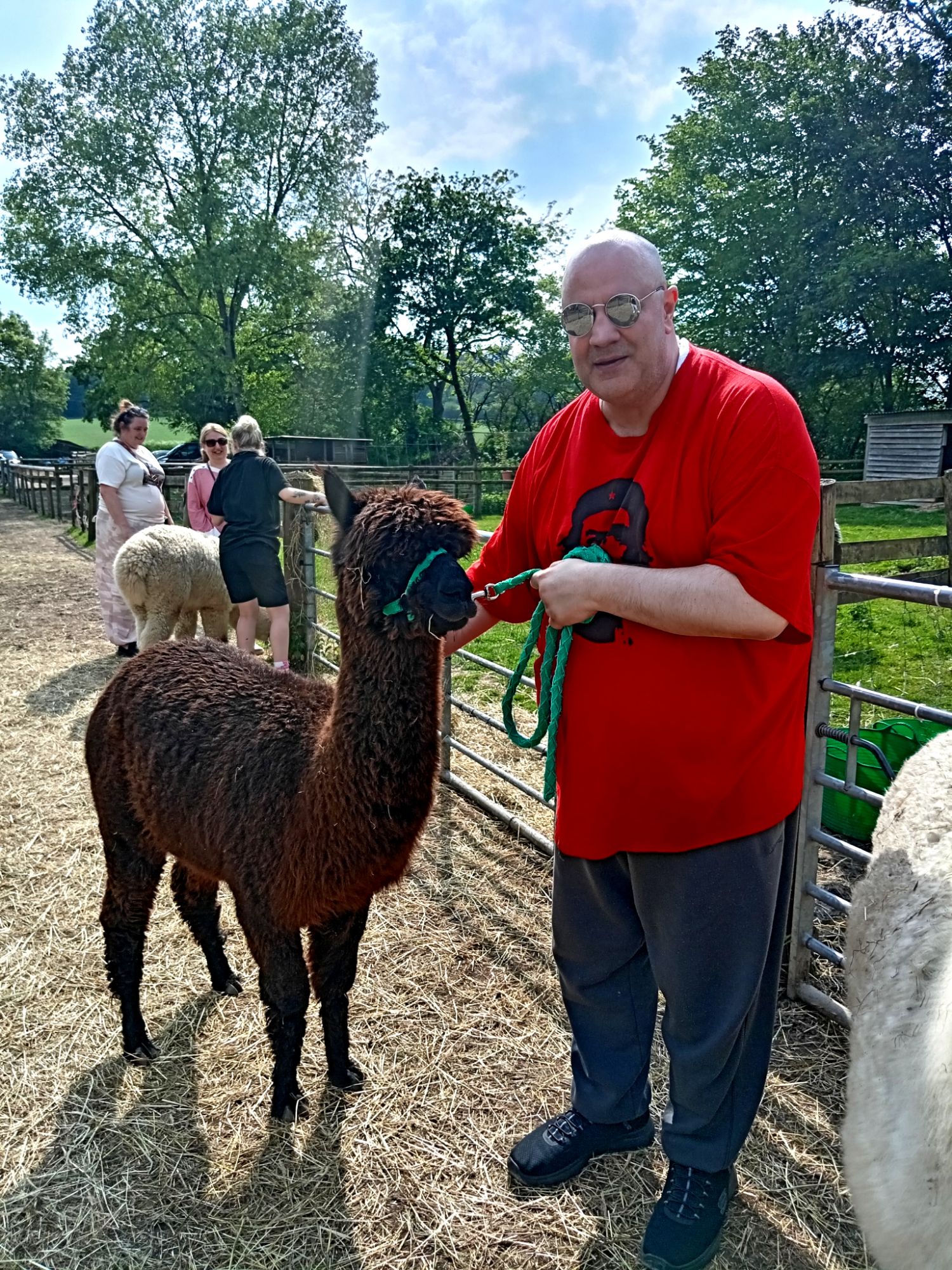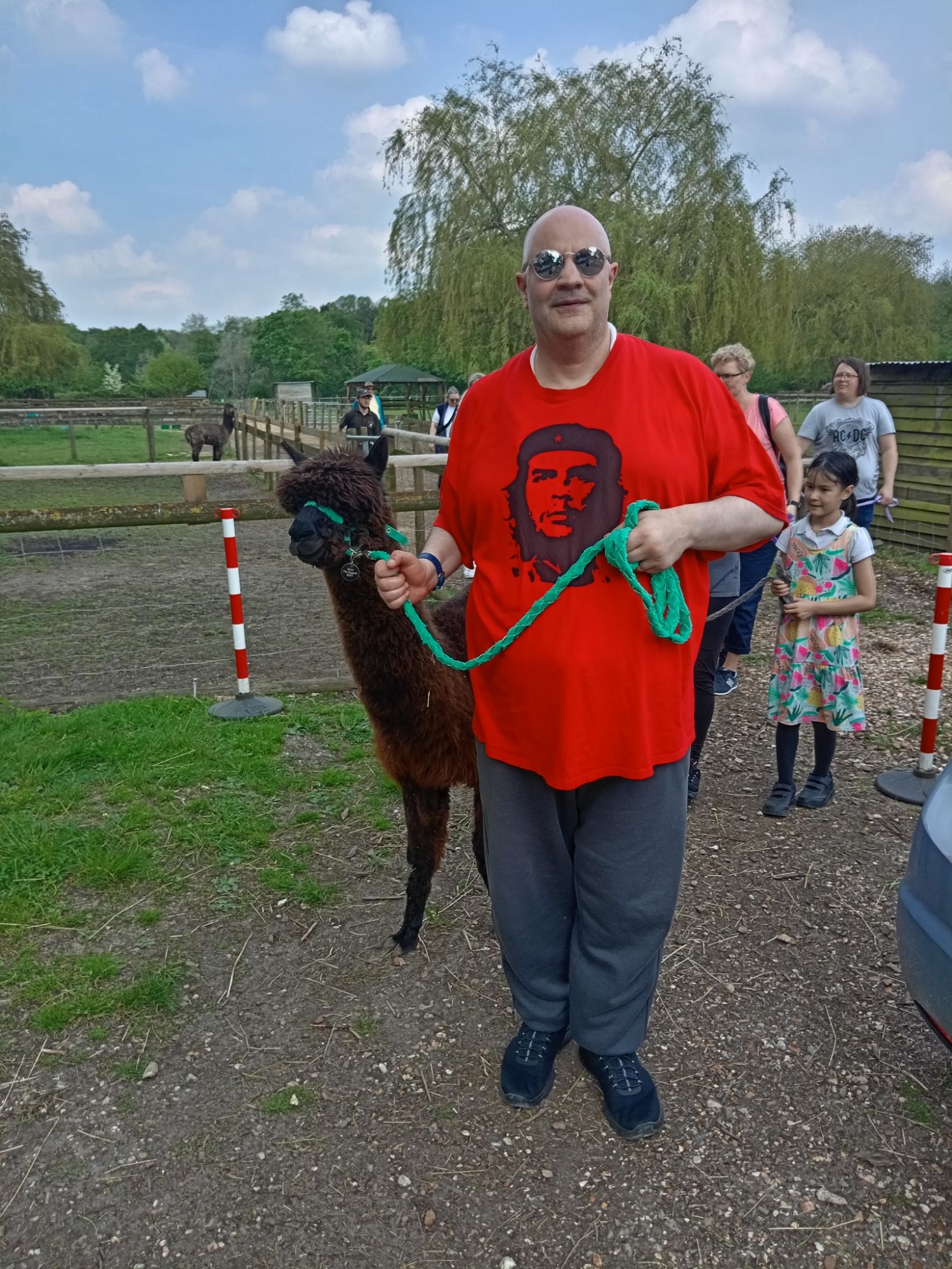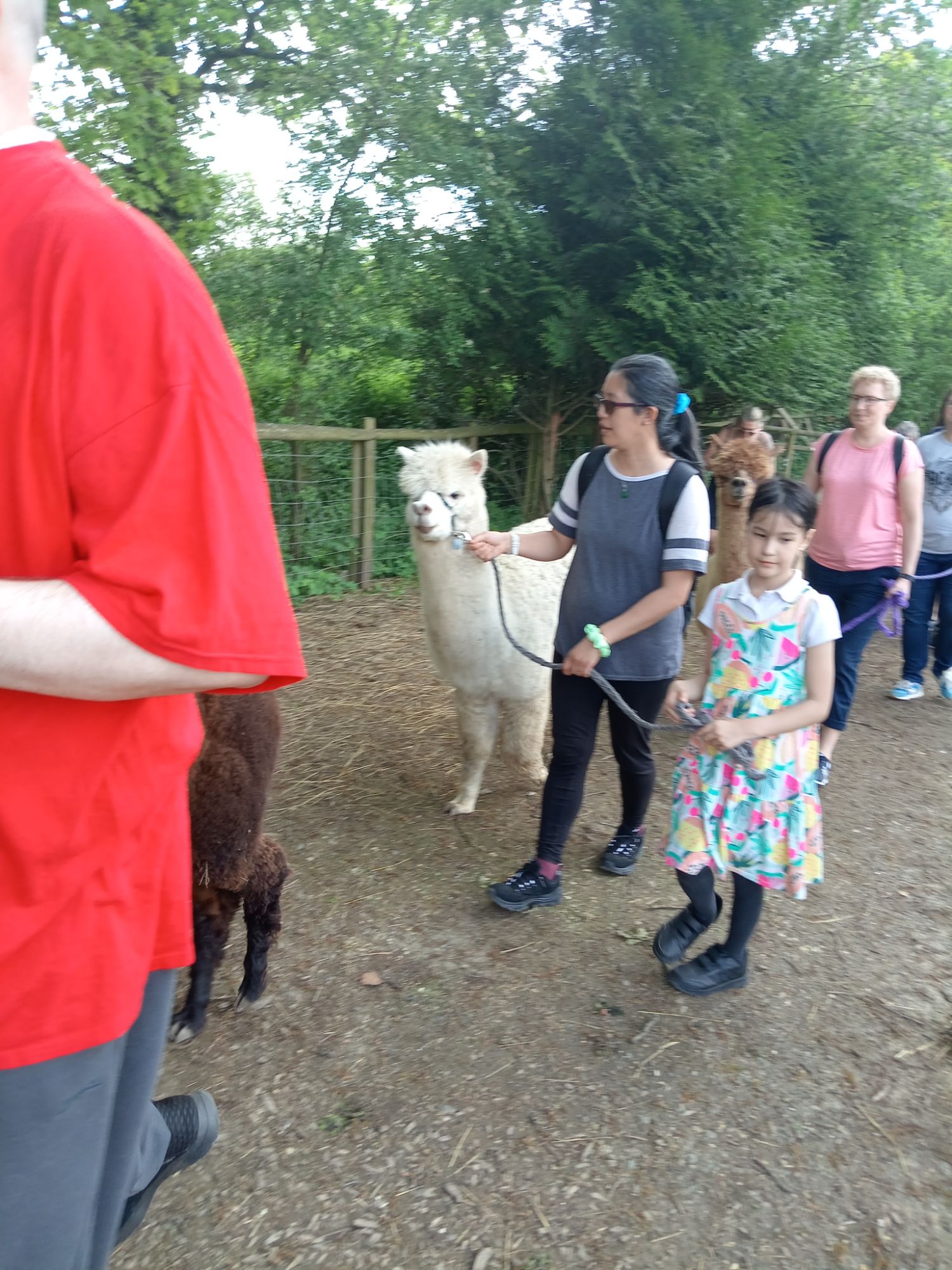 The temperature soared to 25° Celsius as we attempted to navigated our way around all the “A” and “B” roads – so to to avoid all the closed Junctions (8-10) of the M25 Motorway! Apparently, the government is carryout some type of important re-structuring which should make travelling around London a much more efficient undertaking. As matters stood, we travelled 50 miles in two-hours – but arrived at Pennybridge Farm just in time for our 2 pm slot (the meet and greet and then walking of the Alpacas was scheduled to last unto 3:45 pm).