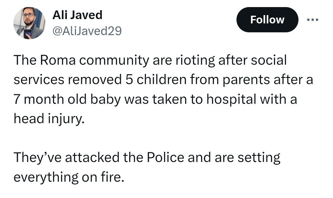 The right wing media is hinting that Muslims are rioting in Leeds – whilst the far-right is blatantly stating it (on Telegram) – blaming this action on a Labour election victory. Picking through the disinformation it would appear that White, Black and Asian people have come to the aid of a Romany family (also referred to as a Romanian family) – after Social Services attempted to take their children into care. A baby was dropped – either a short distance onto the ground by accident – or fell out an upstairs (!) open window with Social Services being called after the fallen baby was taken to hospital.