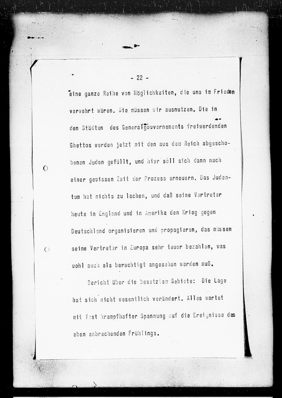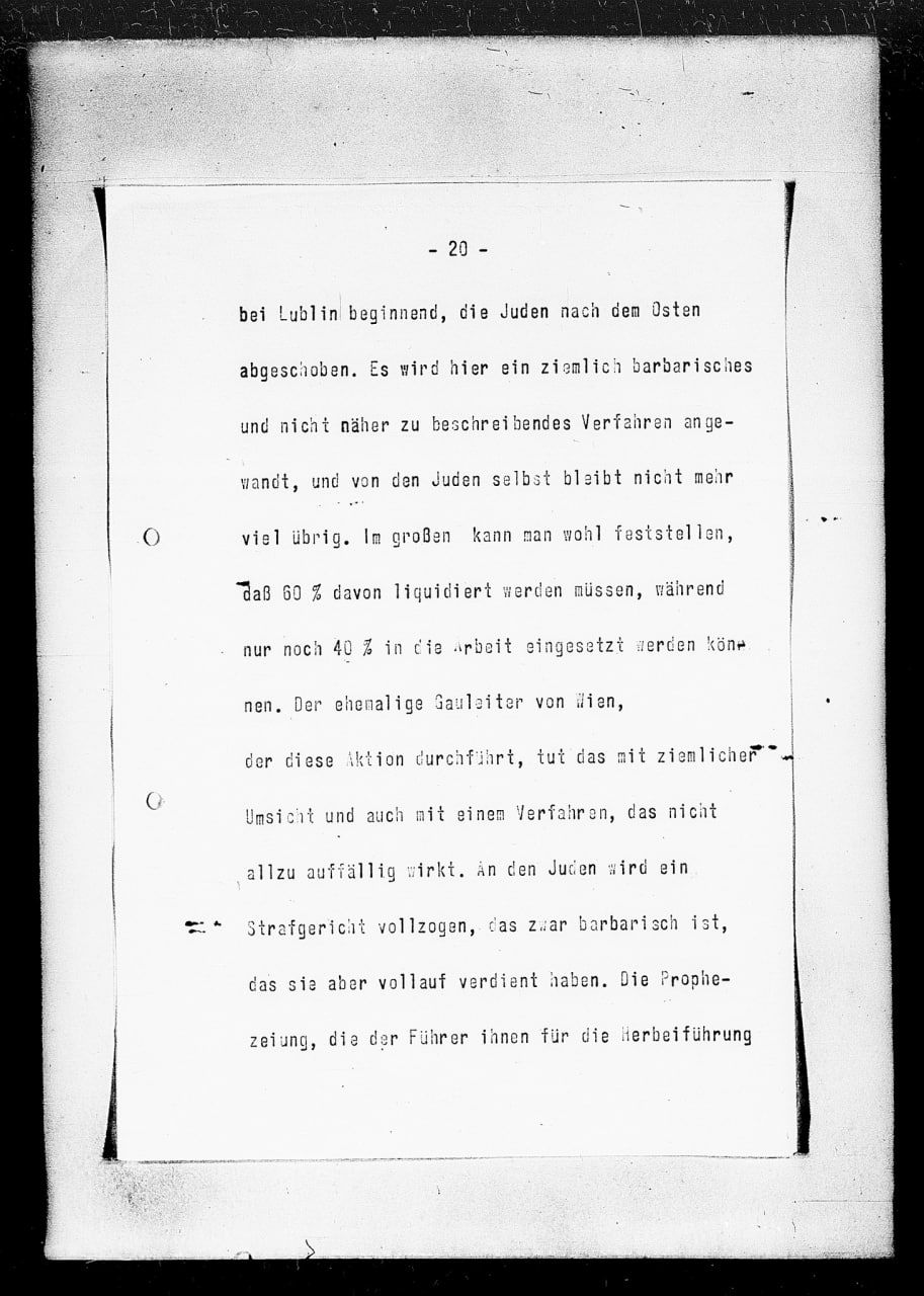 “The Jews are now being pushed out of the General Government, beginning near Lublin, to the East. A pretty barbaric procedure is being applied here, and it is not to be described in any more detail, and not much is left of the Jews themselves. In general one may conclude that 60% of them must be liquidated, while only 40% can be put to work. The former Gauleiter of Vienna [Globocnik], who is carrying out this action, is doing it pretty prudently and with a procedure that doesn’t work too conspicuously. The Jews are being punished barbarically, to be sure, but they have fully deserved it. The prophesy that the Führer issued to them on the way, for the eventuality that they started a new world war, is beginning to realise itself in the most terrible manner. One must not allow any sentimentalities to rule in these matters. If we did not defend ourselves against them, the Jews would annihilate us. It is a struggle for life and death between the Aryan race and the Jewish bacillus. No other government and no other regime could muster the strength for a general solution of the question. Here too, the Führer is the persistent pioneer and spokesman of a radical solution, which is demanded by the way things are and thus appears to be unavoidable. Thank God, during the war we now have a whole series of possibilities which were barred to us in peacetime. We must exploit them. The ghettos which are becoming available in the General Government are now being filled with the Jews who are being pushed out of the Reich, and after a certain time the process is then to renew itself here. Jewry has nothing to laugh about, and the fact that its representatives in England and America are organizing and propagating war against Germany today is something that its representatives in Europe are paying very dearly for, and this must be seen as justified.”