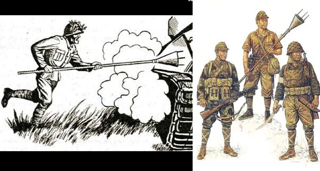 The Imperial Japanese Airforce attacked Soviet Red Army Forces using “Kamikaze” tactics not only from the sky – but also from the ground (using Imperial Japanese Army Suicide Units). The Imperial Japanese Army – Kwantung Army – even formed an entire Motorized Mechanized Brigade of “Kamikaze” (Suicide) Tank Destroyers (comprised of 4,000 volunteers), who were supposed to stop the advance of the Soviet Red Army at the cost of their own lives. The technical side of the issue was simple: from a camouflaged pit, cave, or other hidden area, constructed in a tank-hazardous direction, an Imperial Japanese Army soldier would be expected to wait patiently until the Soviet tank was very close – and then he would run-out and use a mine attached to a long bamboo pole – which would be quickly inserted between or under the tracks of a passing Combat Vehicle. Another option: an Imperial Japanese Army soldier – carrying a backpack filled with explosives – would throw himself under an advancing Soviet tank – exploding the rucksack once in position.
