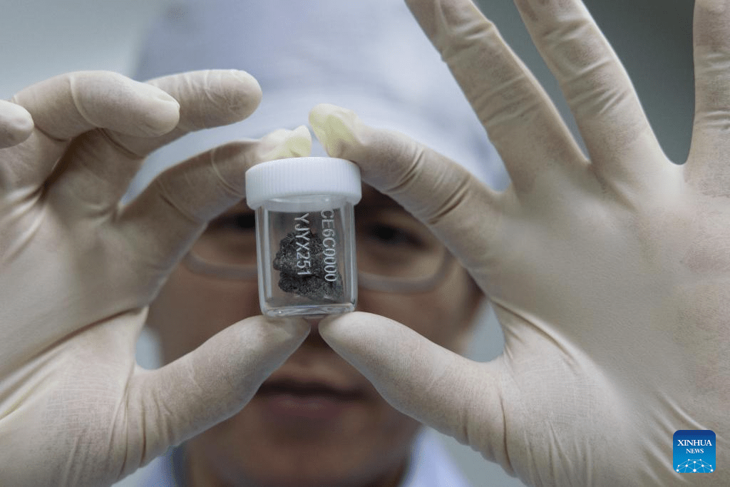 A researcher shows a lunar sample retrieved by the Chang’e-6 mission at the lunar sample laboratory in the National Astronomical Observatories of the Chinese Academy of Sciences (CAS) in Beijing, capital of China, Sept. 24, 2024. (Xinhua/Jin Liwang)
