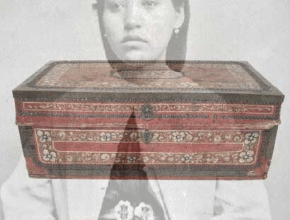 “Small Chinese trunk: Small Chinese chest that once belonged to James Tilton Pickett, 1820-ca. 1850. Rectangular with hinged lid. Round brass ring on front of lid. Escutcheon that is roughly triangular at center top of front of chest. Chest made of wood, possibly camphorwood, with exterior surface covered with red dyed leather. Painted design in large border pattern forming rectangles on lid, front and ends. Four petaled flowers at corners and series of fines with curled leaves and additional flowers along band. Lid edge fitted with brass. Between the design and brass is a double row of brass tacks. A single row of brass tacks extends around the floral design at the center of the lid. Similar design and tack ornamentation on sides and front of box. At either end is curved brass handle. Back is paintged red but without further decoration. Base is raised with wood strips extending around edges. Interior is undecorated but with smooth finished wood. On left side is a flat brass rod designed to hold up lid. This type of trunk was sold by the Hudson’s Bay Company. Note an image of a Haida woman is overlayed over the trunk. ~ Source: Hudson Bay Company property of Mrs. Pickett ~ Creator: China ~ Date: 1820-1850“