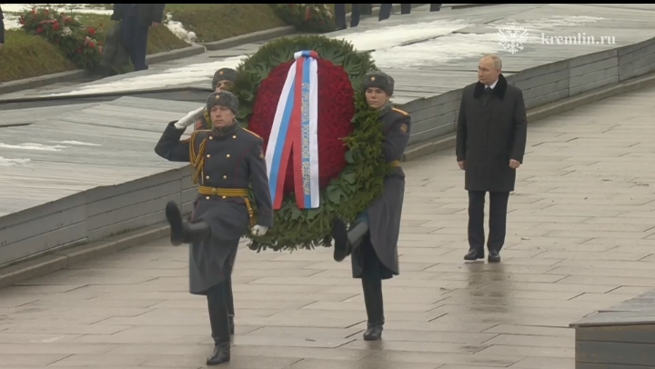 At the Piskaryovskoye Memorial Cemetery of St Petersburg (Leningrad), the President laid a wreath at the Motherland monument to honour the memory of the fallen Leningrad residents and defenders.