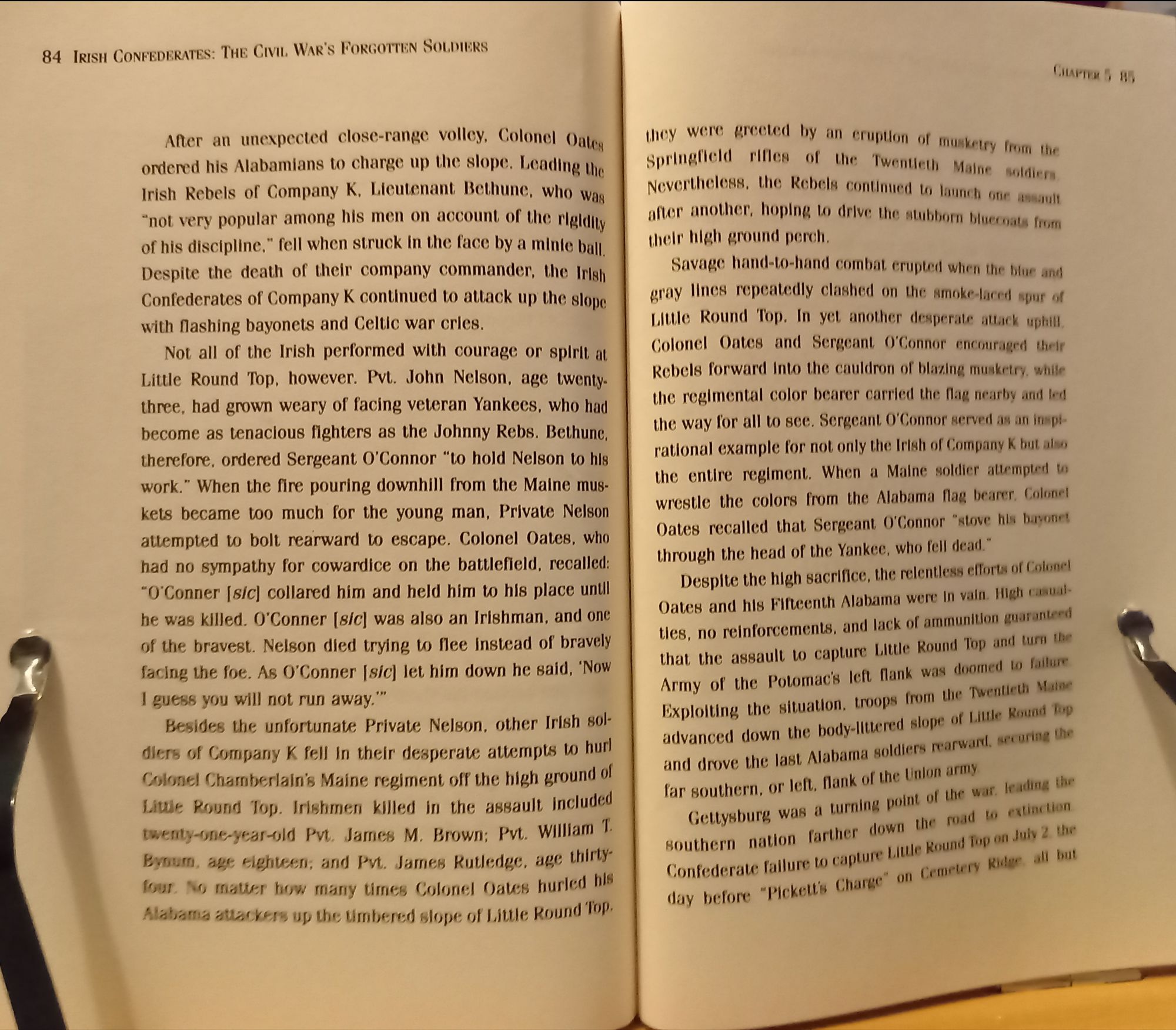 The weather was hot – and the Confederates had to advance over open ground before storming an inclined slope (in the form of a steep hill) – with the intention of sweeping the Federals off its top and consolidating the victory. The previous day had seen the Confederates sweep the Federals out of West and Central Gettysburg – and into the hills to its East. Washington was just 80 miles to the South – and legend has it that Lincoln was packing his belongings to flee! I have audio-typed part of a chapter from Stephen Sears’ book – carefully reproducing the text from an Audible edition (in my native British English). This provides a general background to the battle – but does not mention the Irish specifically – other than one or two fighting for the Union. For the story of “Company K” of the 15th Alabama Regiment of the Confederate States of America (CSA) – we must turn to the excellent work of Phillip Thomas Tucker – who has produced an excellent book examining the contribution to the Confederate cause made by the Irish! I am proud of these Irishmen who attacked up this hill for the freedom they sought! ACW (3.4.2025)