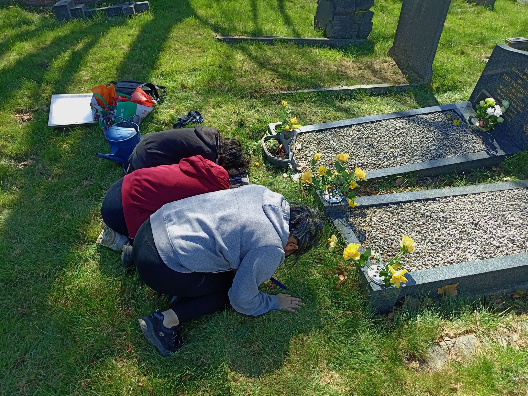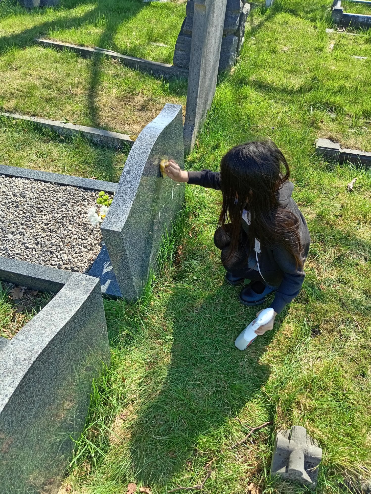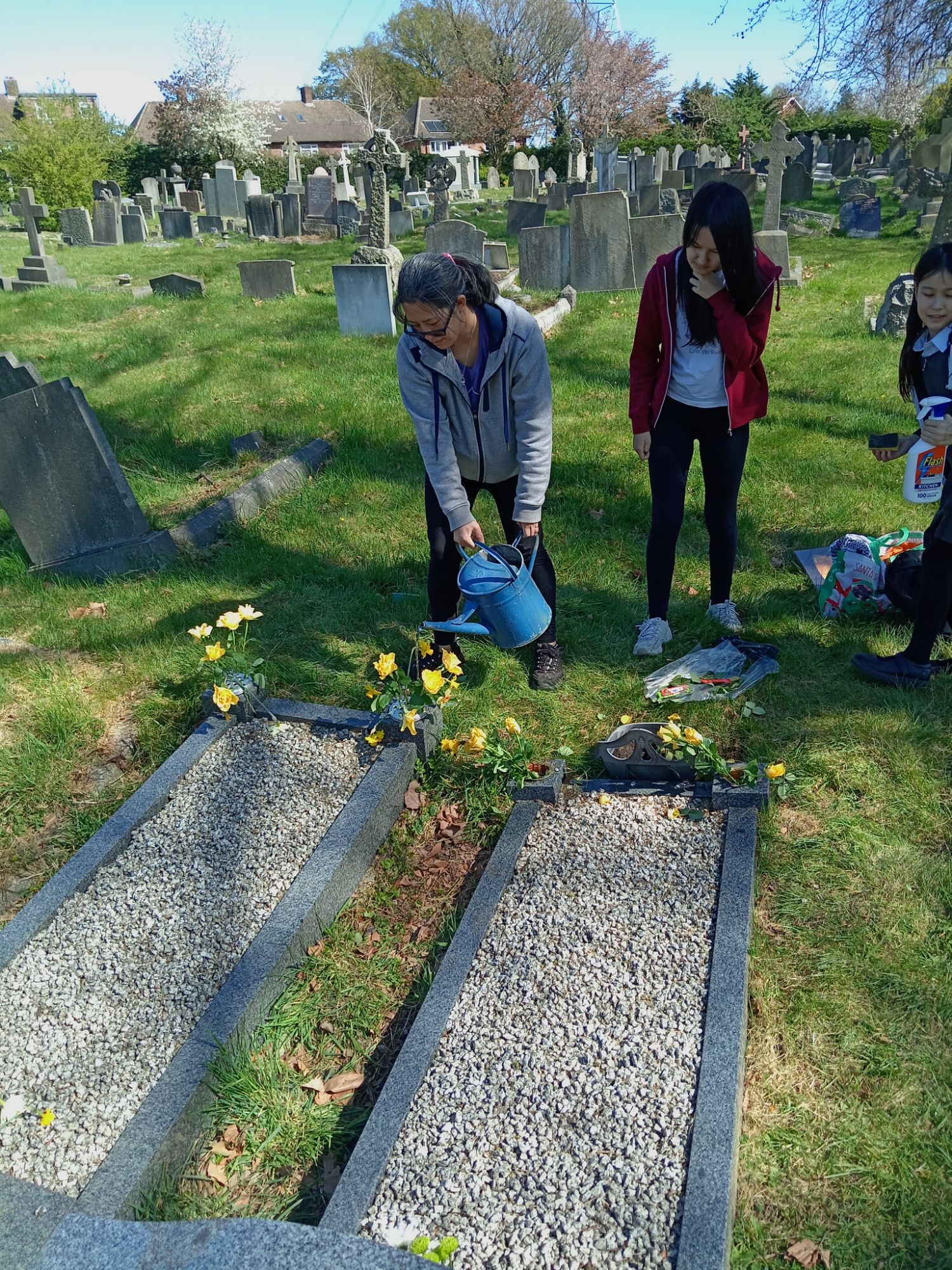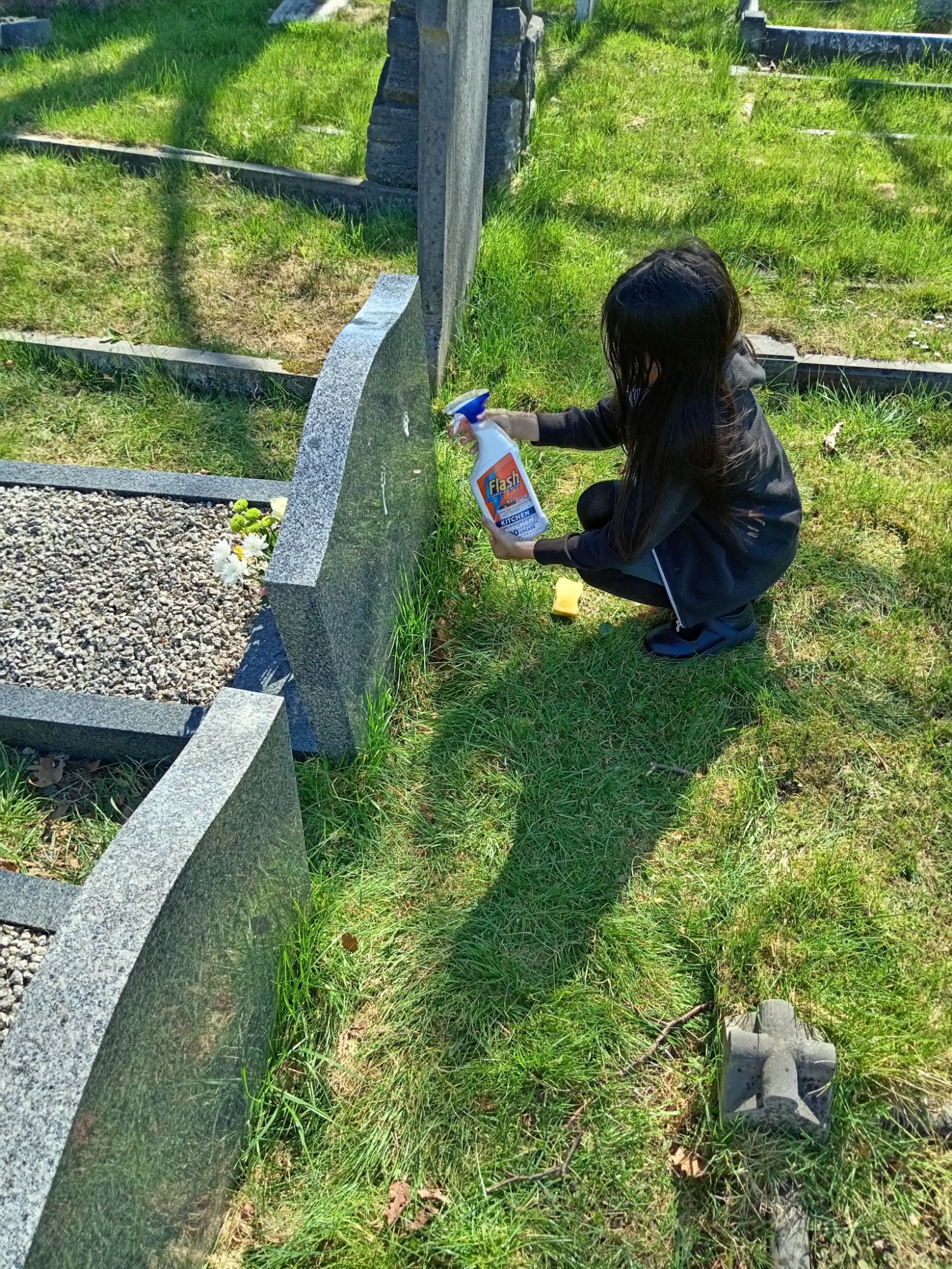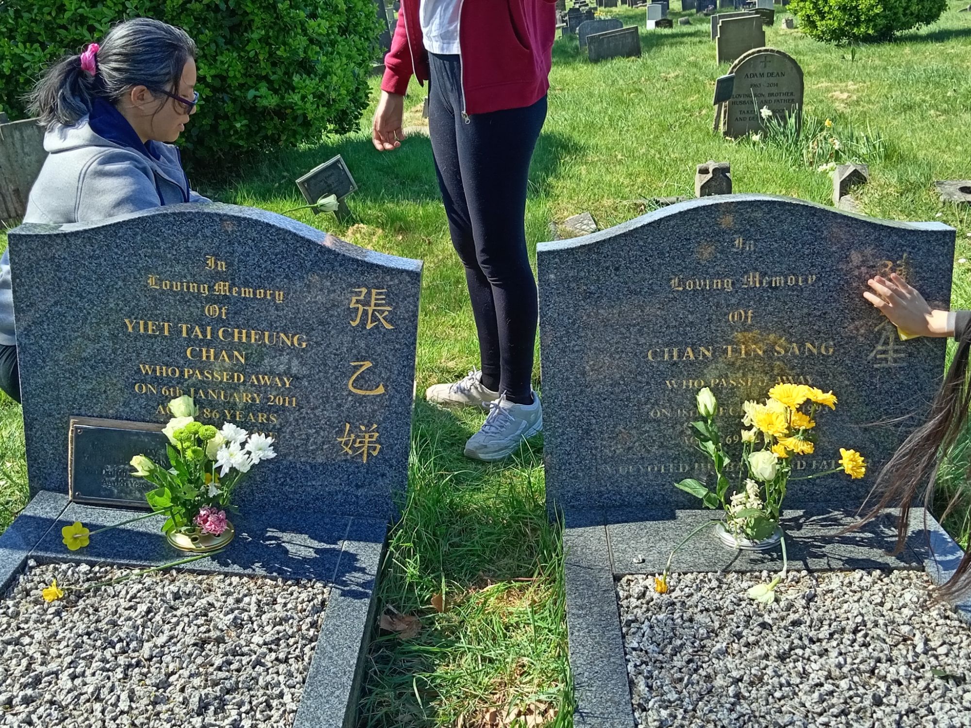 Some Chinese families – although not ours – make paper clothing which is burnt at the graveside in Autumn – alongside “Spirit Money” – or pretend banknotes, etc. Others take real food which is placed on a table in hygienic containers – offered as an oblation – and consumed later. Our two daughters used clothes and cleaning sprays to remove the dirt and shine the stone exterior of the graves. The bright flowers are then cut to fit into the holders. We often bring a flag of China and Buddhist pictures and statues. Today, I also carried a Ch’an Dao Martial Arts Association badge and a pair of Nunchaku. We lit six incense-sticks – three for each grave – and bowed-down three-tips (clapping the hands three-times). We have been performing these rituals since the early 1990s in the UK.