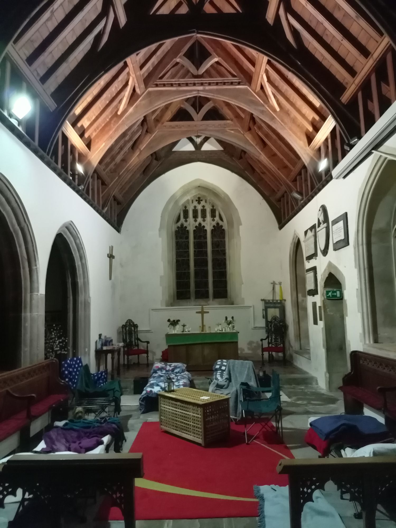 Clearing the mind and relaxing the body. Sat on an old wooden chair to the left of the Altar – this will be my perch for the night. No belief, no fear, and no direction. The stone interior is cool to the touch and yet the air has a distinct humidity about it. Here I sit. The Priest is adamant that I will experience a supernatural event before the night is out. Really? I am irreligious in the literal sense – but have nothing against religious belief per se. Politicised or class ridden religion is dangerous to society and to each individual that follows or encounters it. So be it. I have no idea as to whether god exists – all I know is that various Priests have sat in this wooden chair going back nearly a thousand years. The stone walls and wooden beams are echoey. in fact, the roof looks like the interior of Noah’s Ark (in my imagination):
