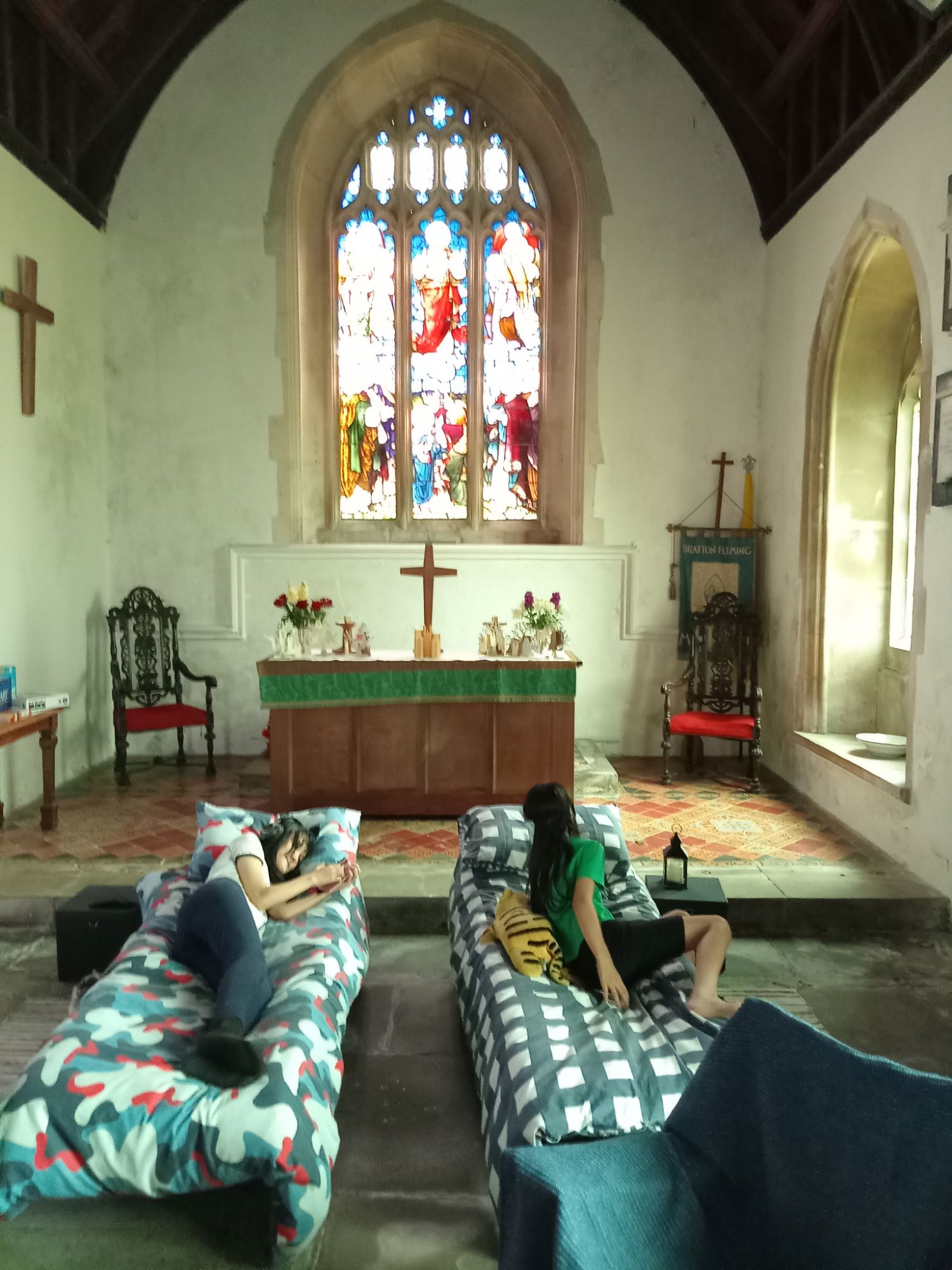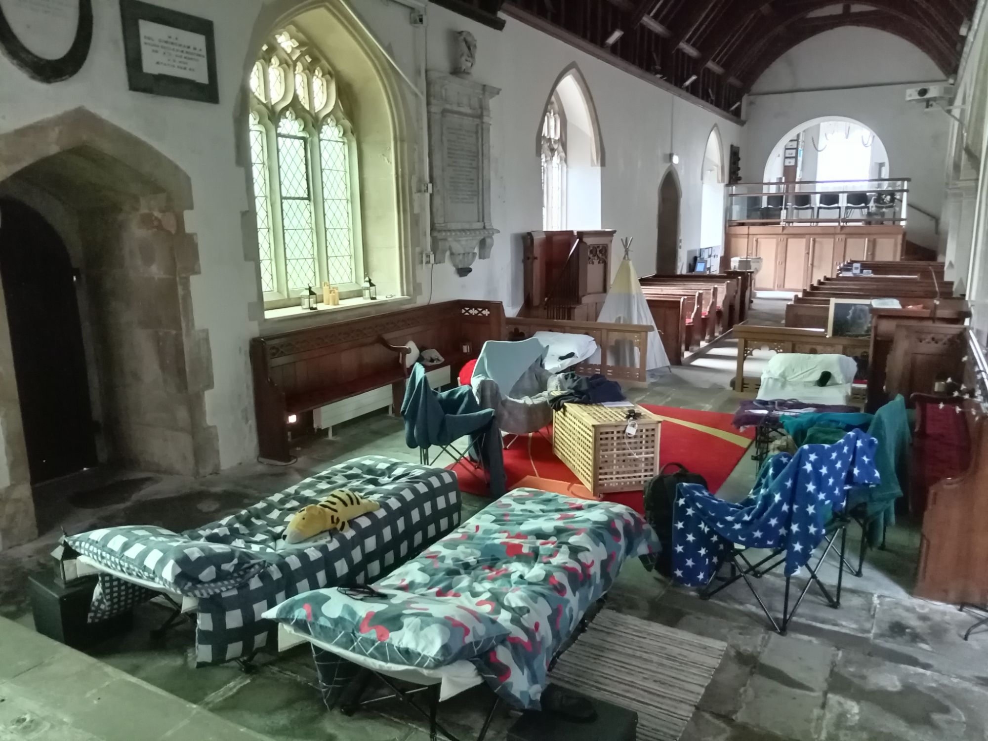 Whilst visiting various Churches in Northants – we discovered a leaflet that spoke about the concept of “Champing”. This is the idea that the interior of a Church is used for “camping”. The point of this is to raise money to pay to keep an old Church existing at a time when the State will not set apart any extra funds – even though everyone (Christian or not) in the UK pays for the Church of England through their tax. Well, we thought this to be an extraordinary development and decided to see what it is all about. For a not so cheap fee – the Church Authorities allow a group of people to occupy the interior of a Church from between 4pm – 10am the next morning. Strange but true. The doors are locked and the camp-beds are laid-out. There are fully functioning toilets and a kitchen, etc.