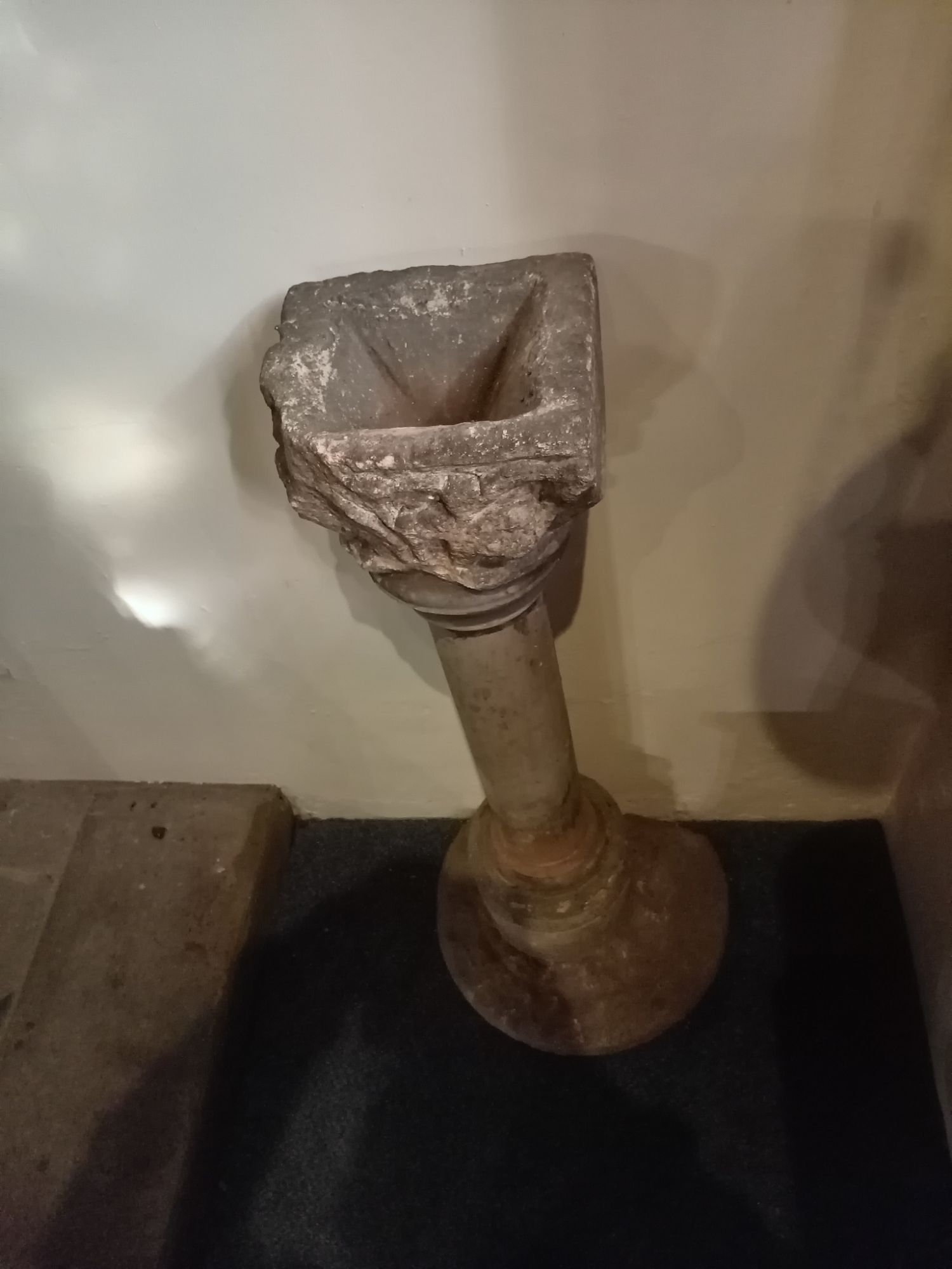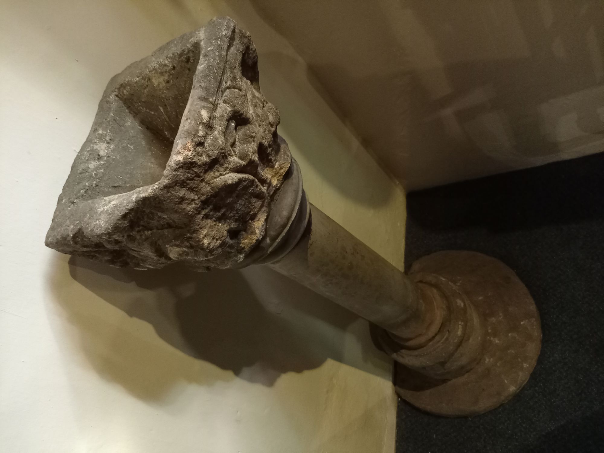 Today, completely to my surprised, I relocated the now thoroughly (professionally) cleaned eagles perched on top of two purpose-built plinths inside St Nicholas Church – together with an explanation as to the history of these two interesting objects. I will address the stain-glass aspect of this visit on another post – but the stones section of this exhibition consisted of these two eagles – and a 14th century stone bowl (found buried in the graveyard) used by the Catholic Priests to wash their hands during Services!
