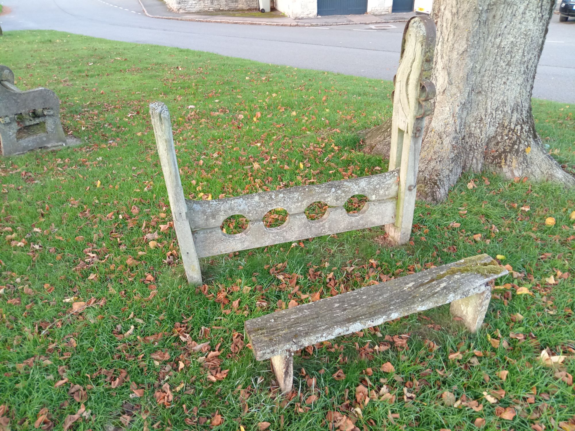 ‘Village stocks of C18/early C19. Wood. Set of double place stocks with adjoining bench seat.’
