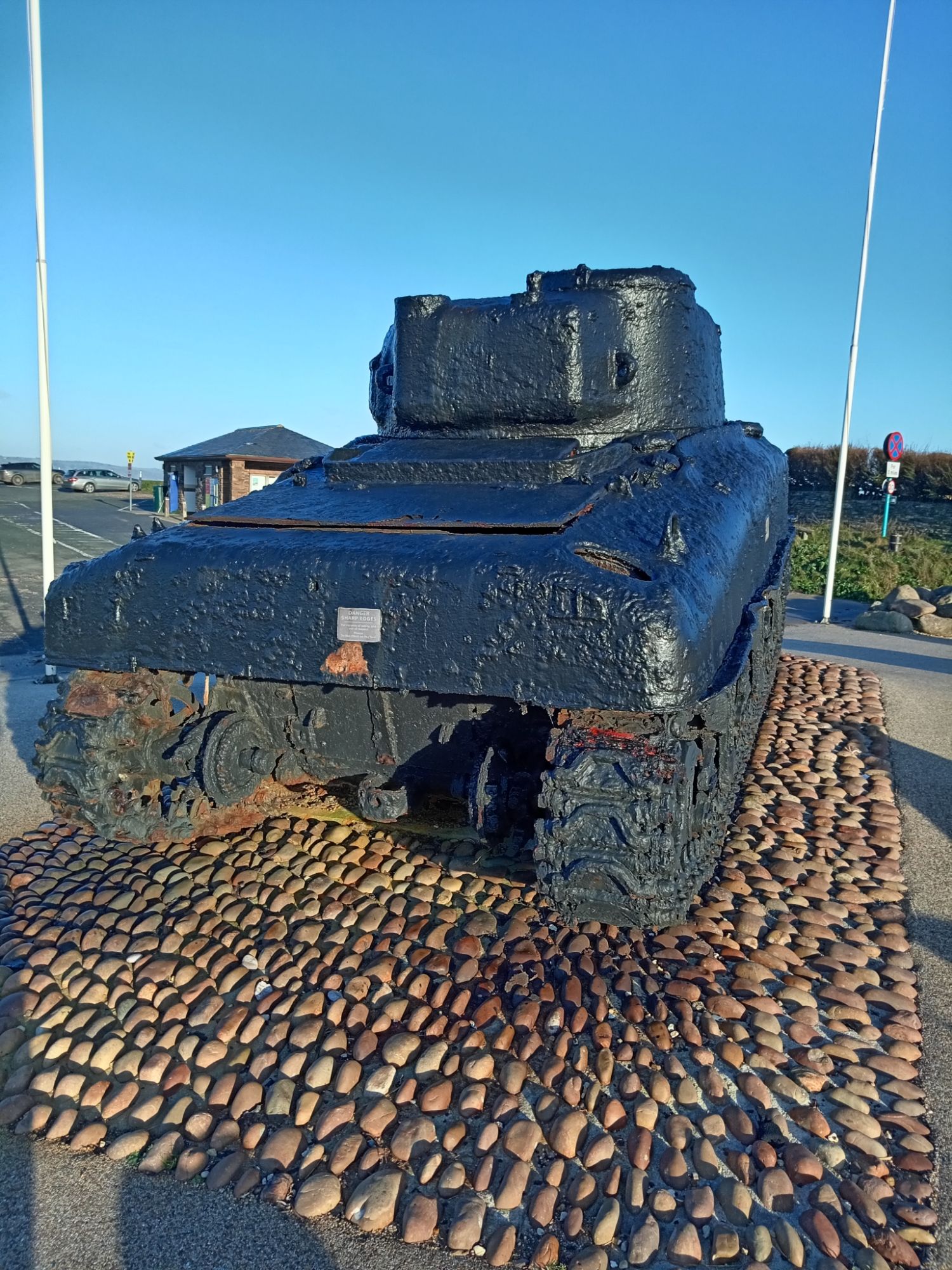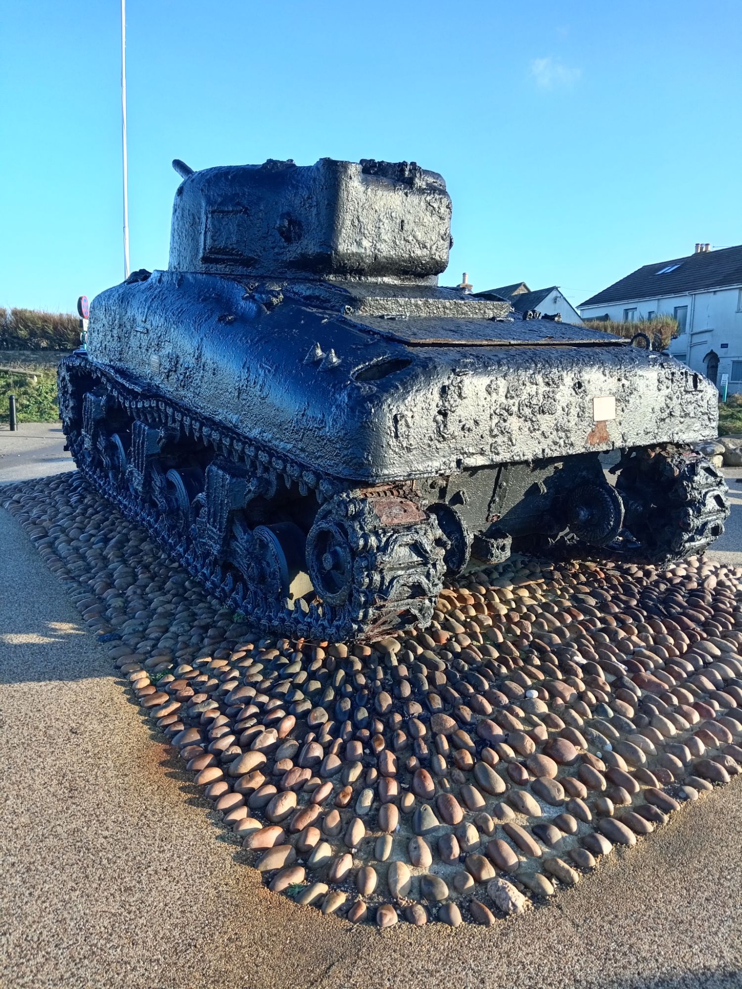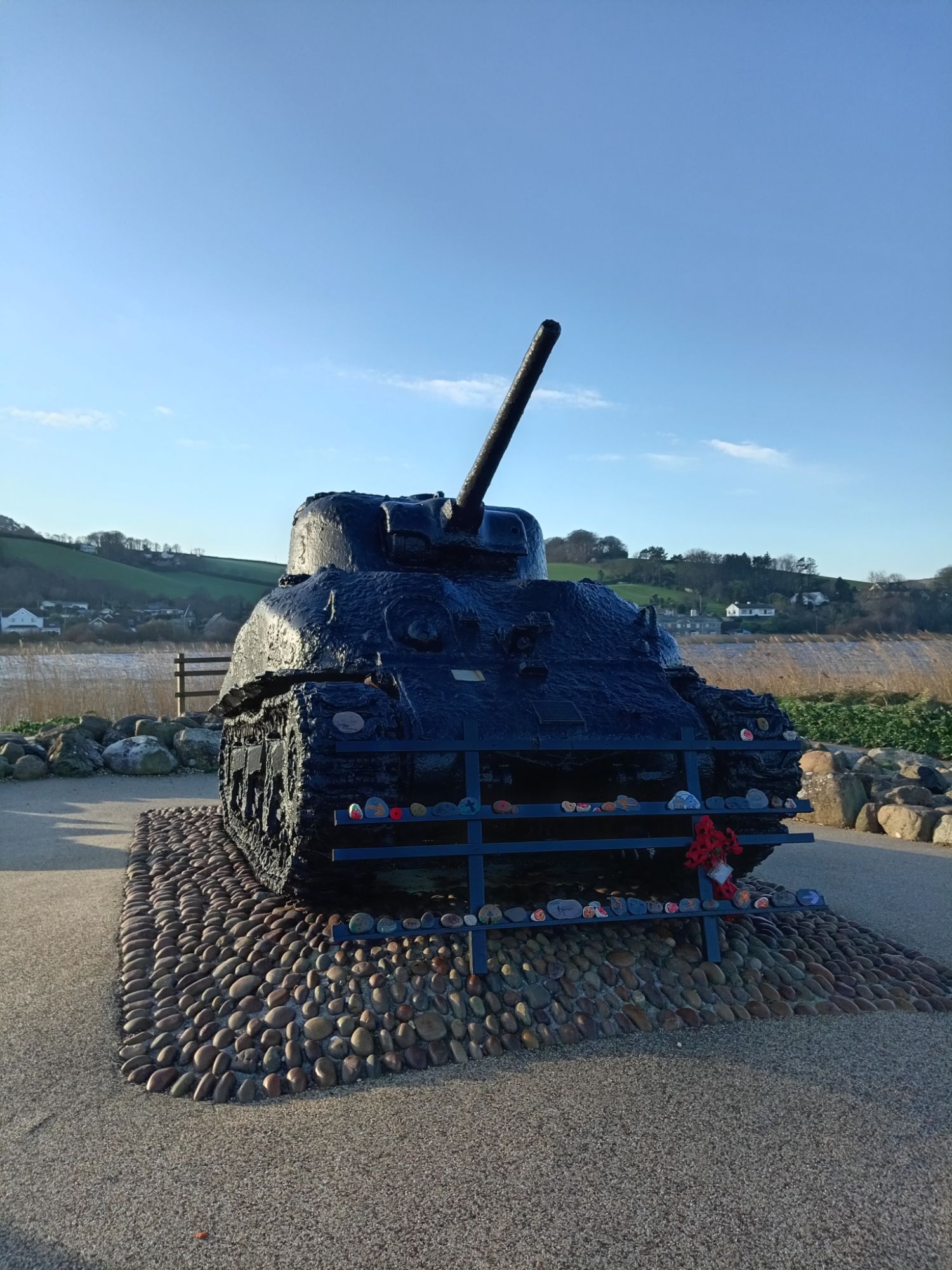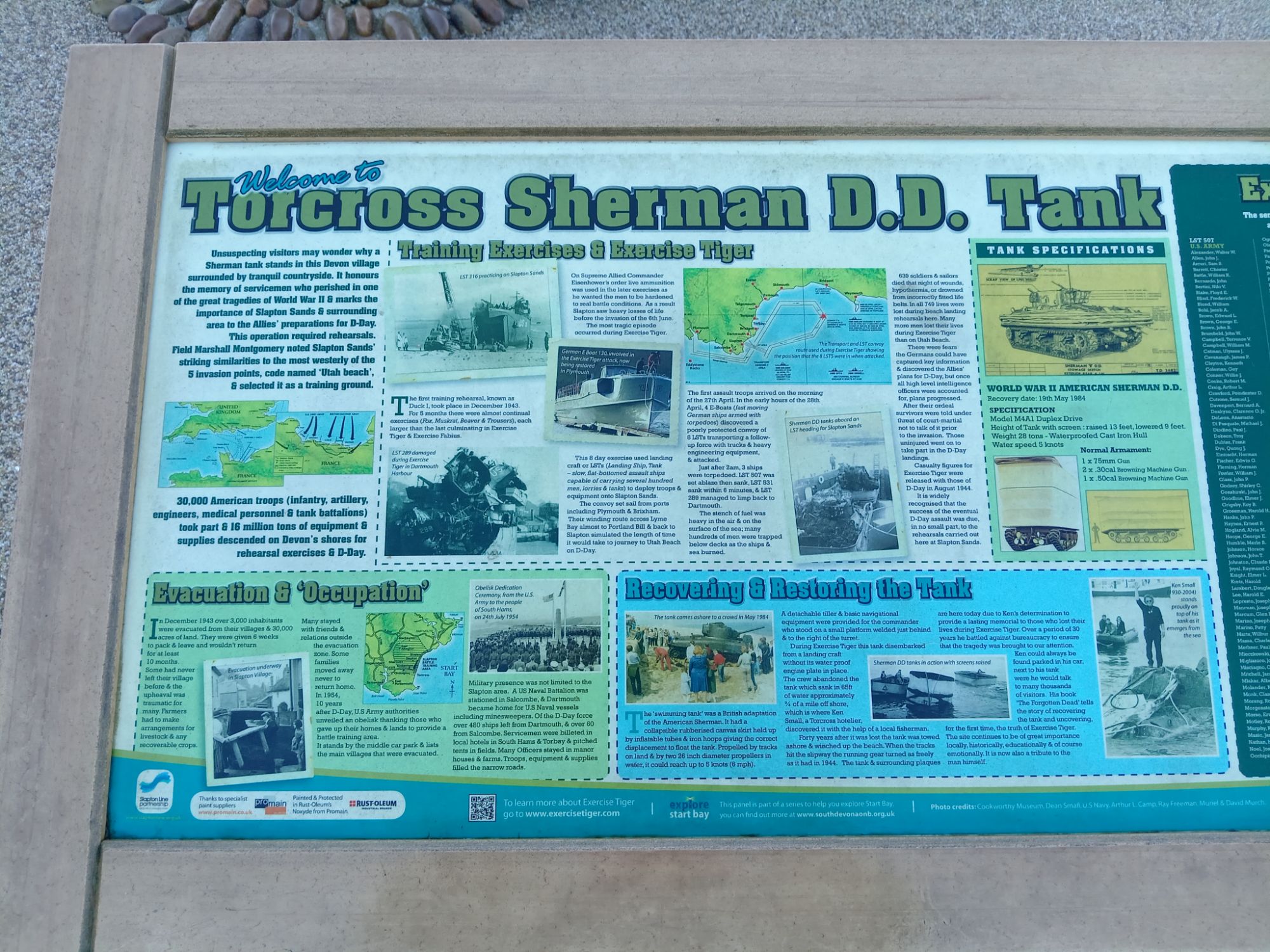 ‘A restored American Sherman tank. The memorial consists of two bronze plaques behind the tank.InscriptionPlaque 1: OPERATION TIGER MEMORIAL Dedicated by the United States of America in honor of the men of the USS Army’s 1st Engineer Special Brigade, the 4th Infantry Division, and the VII Corps Headquarters; and the US Navy’s 11th Amphibious Force who perished in the waters of Lyme Bay during the early hours of April 28, 1944. They were on board landing ships, tank (LSTs) or a convoy participating in Operation Tiger, a training exercise at Slapton Sands, Torcross, England. The exercise was in preparation for the assault on enemy forces at Utah Beach, Normandy, France. A surprise encounter with German torpedo boats (Schnellboots) resulted in the tragic loss of two of the landing ships and damage to two others. The lessons learned in this tragedy added significantly to the success of the Allies on the D-day landings on Normandy. May all these soldiers and sailors be remembered not only for their sacrifice but also for their contributions to the Allied cause in World War II. DONATED BY THE 1ST ENGINEER SPECIAL BRIGADE ASSOCIATION Plaque 2: THIS AMERICAN SHERMAN TANK TOOK PART IN THE D-DAY PRACTICE LANDINGS AT SLAPTON BEACH IN 1944 WHERE IT WAS LOST AT SEA AND THERE REMAINED UNTIL ITS RECOVERY IN 1984 IT STANDS AS A MEMORIAL TO THOSE AMERICAN LIVES LOST DURING THE COURSE OF THE D-DAY PRACTICE LANDINGS AT SLAPTON BEACH IN 1944 THEIR SACRIFICE WAS NOT IN VAIN BE THEY EVER AT PEACE’