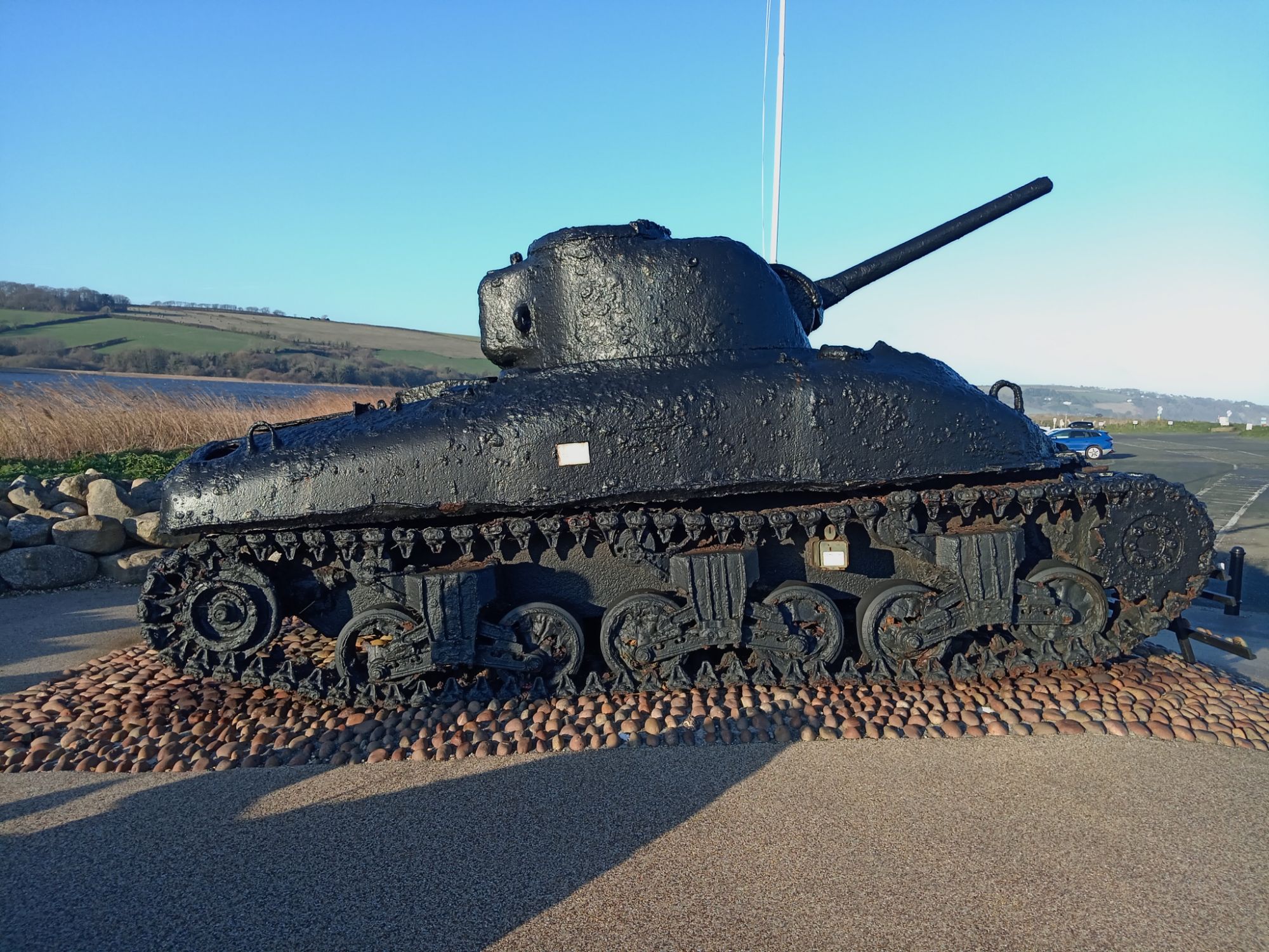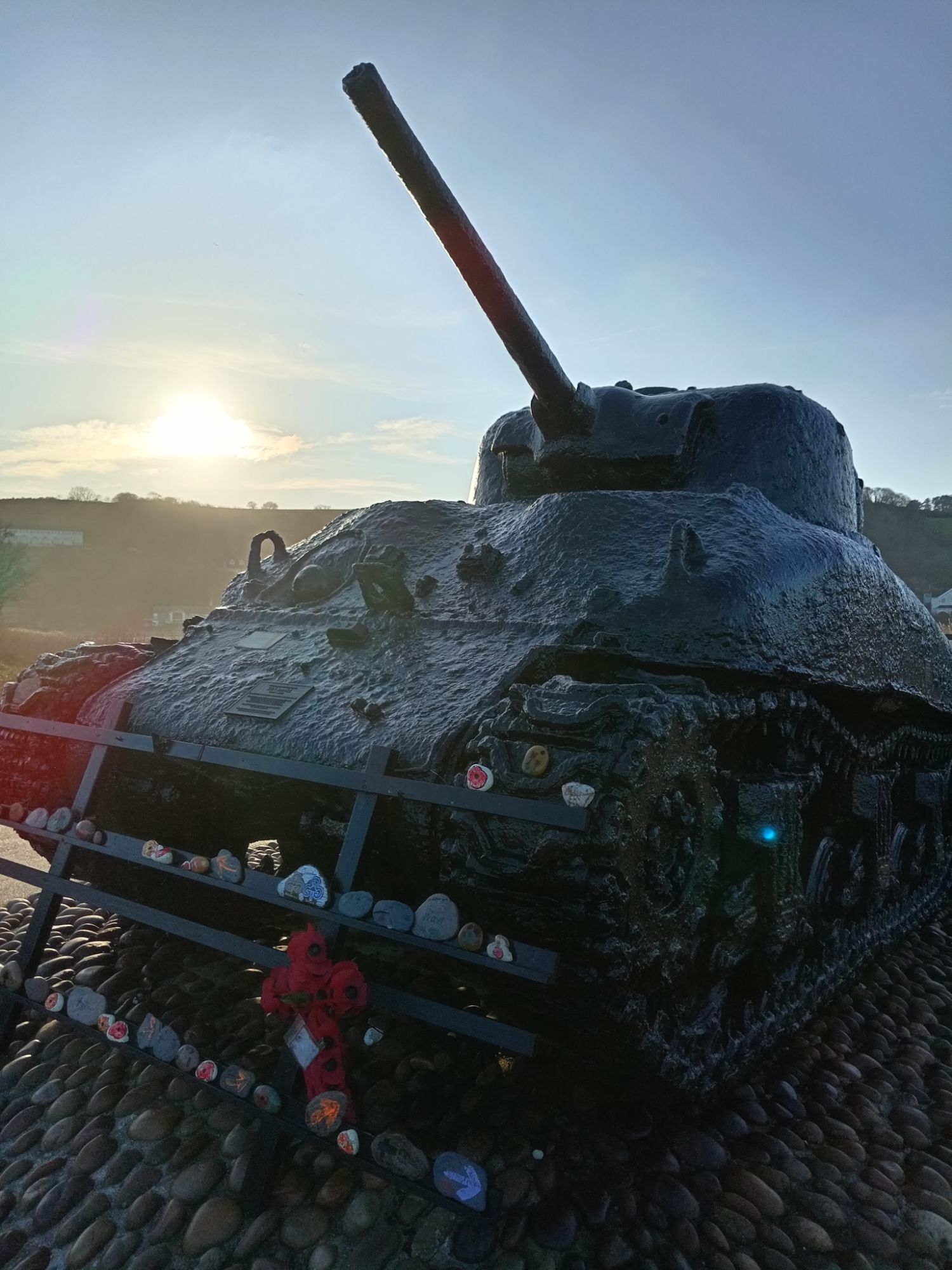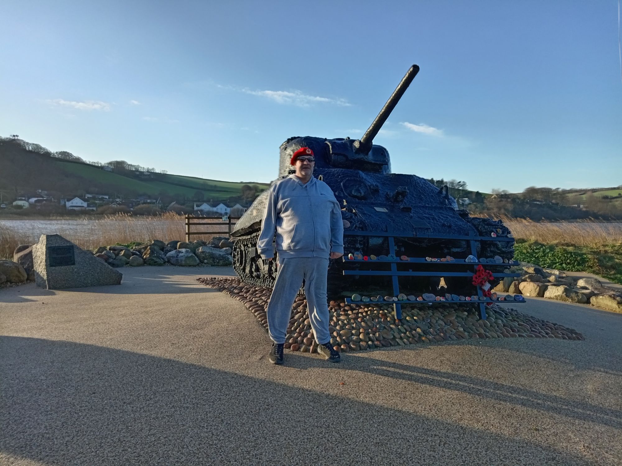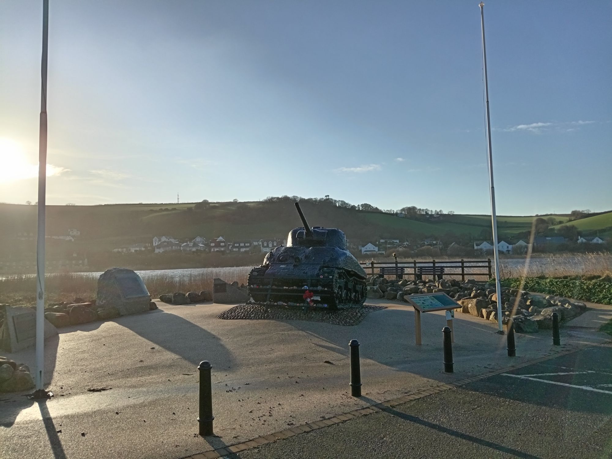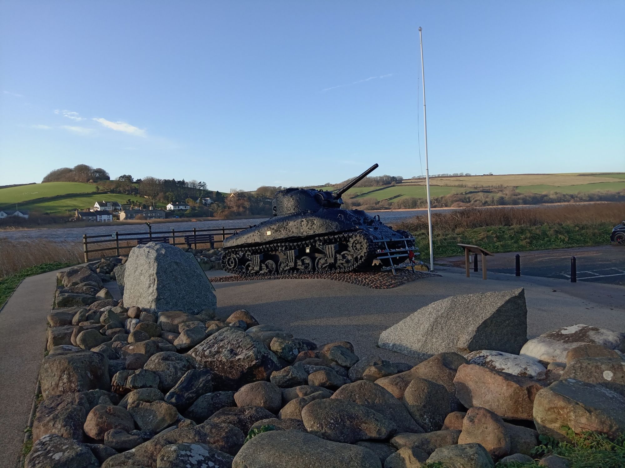 ‘A restored American Sherman tank. The memorial consists of two bronze plaques behind the tank.InscriptionPlaque 1: OPERATION TIGER MEMORIAL Dedicated by the United States of America in honor of the men of the USS Army’s 1st Engineer Special Brigade, the 4th Infantry Division, and the VII Corps Headquarters; and the US Navy’s 11th Amphibious Force who perished in the waters of Lyme Bay during the early hours of April 28, 1944. They were on board landing ships, tank (LSTs) or a convoy participating in Operation Tiger, a training exercise at Slapton Sands, Torcross, England. The exercise was in preparation for the assault on enemy forces at Utah Beach, Normandy, France. A surprise encounter with German torpedo boats (Schnellboots) resulted in the tragic loss of two of the landing ships and damage to two others. The lessons learned in this tragedy added significantly to the success of the Allies on the D-day landings on Normandy. May all these soldiers and sailors be remembered not only for their sacrifice but also for their contributions to the Allied cause in World War II. DONATED BY THE 1ST ENGINEER SPECIAL BRIGADE ASSOCIATION Plaque 2: THIS AMERICAN SHERMAN TANK TOOK PART IN THE D-DAY PRACTICE LANDINGS AT SLAPTON BEACH IN 1944 WHERE IT WAS LOST AT SEA AND THERE REMAINED UNTIL ITS RECOVERY IN 1984 IT STANDS AS A MEMORIAL TO THOSE AMERICAN LIVES LOST DURING THE COURSE OF THE D-DAY PRACTICE LANDINGS AT SLAPTON BEACH IN 1944 THEIR SACRIFICE WAS NOT IN VAIN BE THEY EVER AT PEACE’