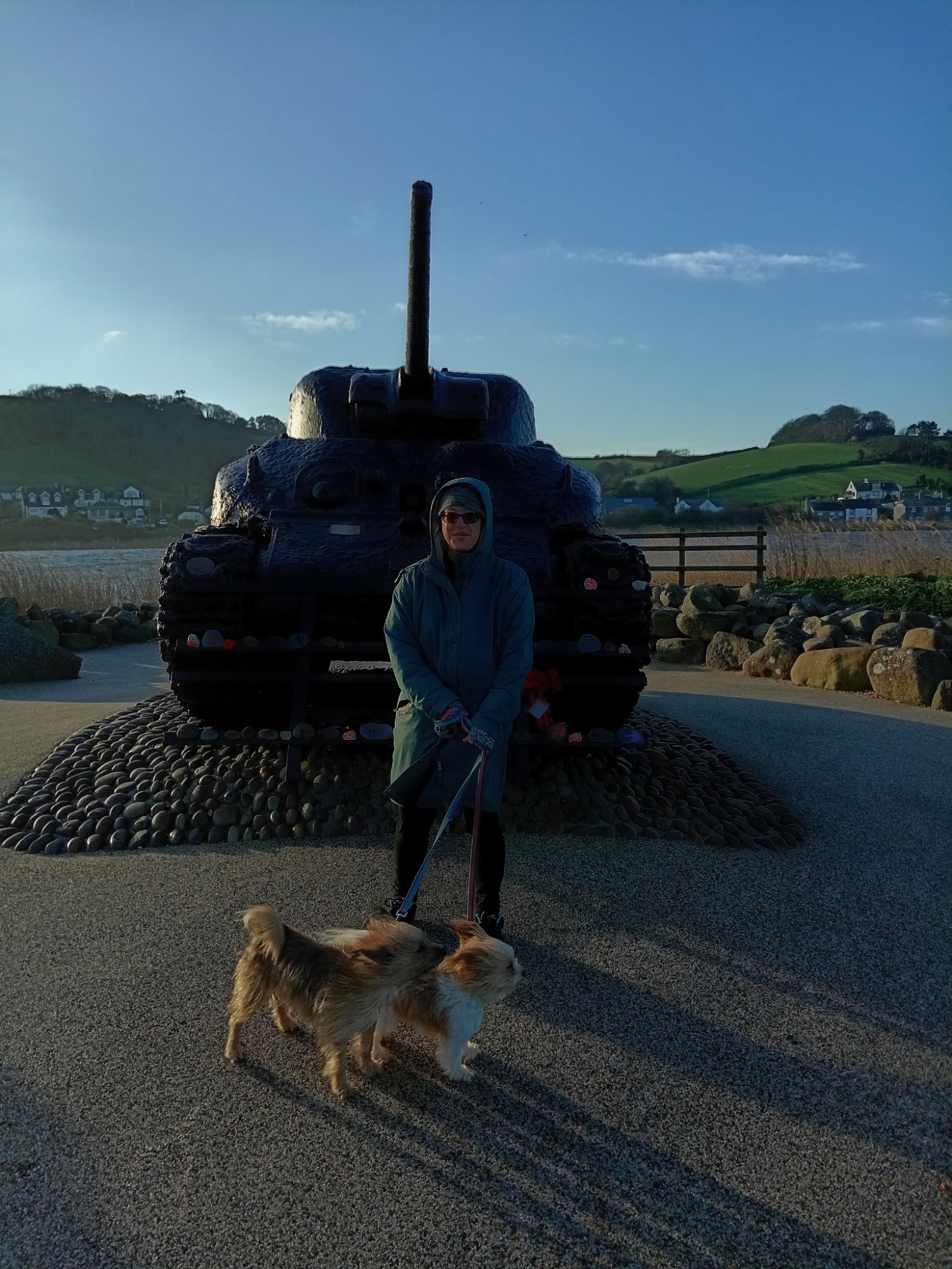 Myself and Gee drove the 20-odd miles from Galmpton to Torcross on the South Devon coast to pay our respects to a WWII War Memorial respectfully situated on the edge of a local car-park (as big as I am – the wind was nearly lifting me off my feet). As it is mid-winter in the UK at the moment – the weather is cold, windy and wet. Many tens of thousand of British, American, and other Allied men (and some women) trained day and night on the South Devon coast in preparation for a mass-landing on the beaches of Northern France. However, it is within the nature of such huge mobilisations that accidents and tragedies will occur – and the events in and around Torcross was no different.