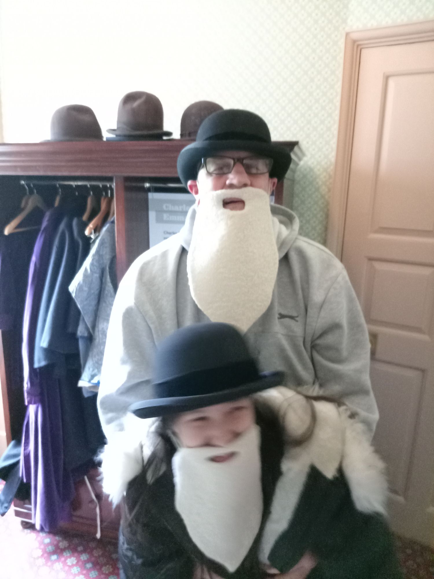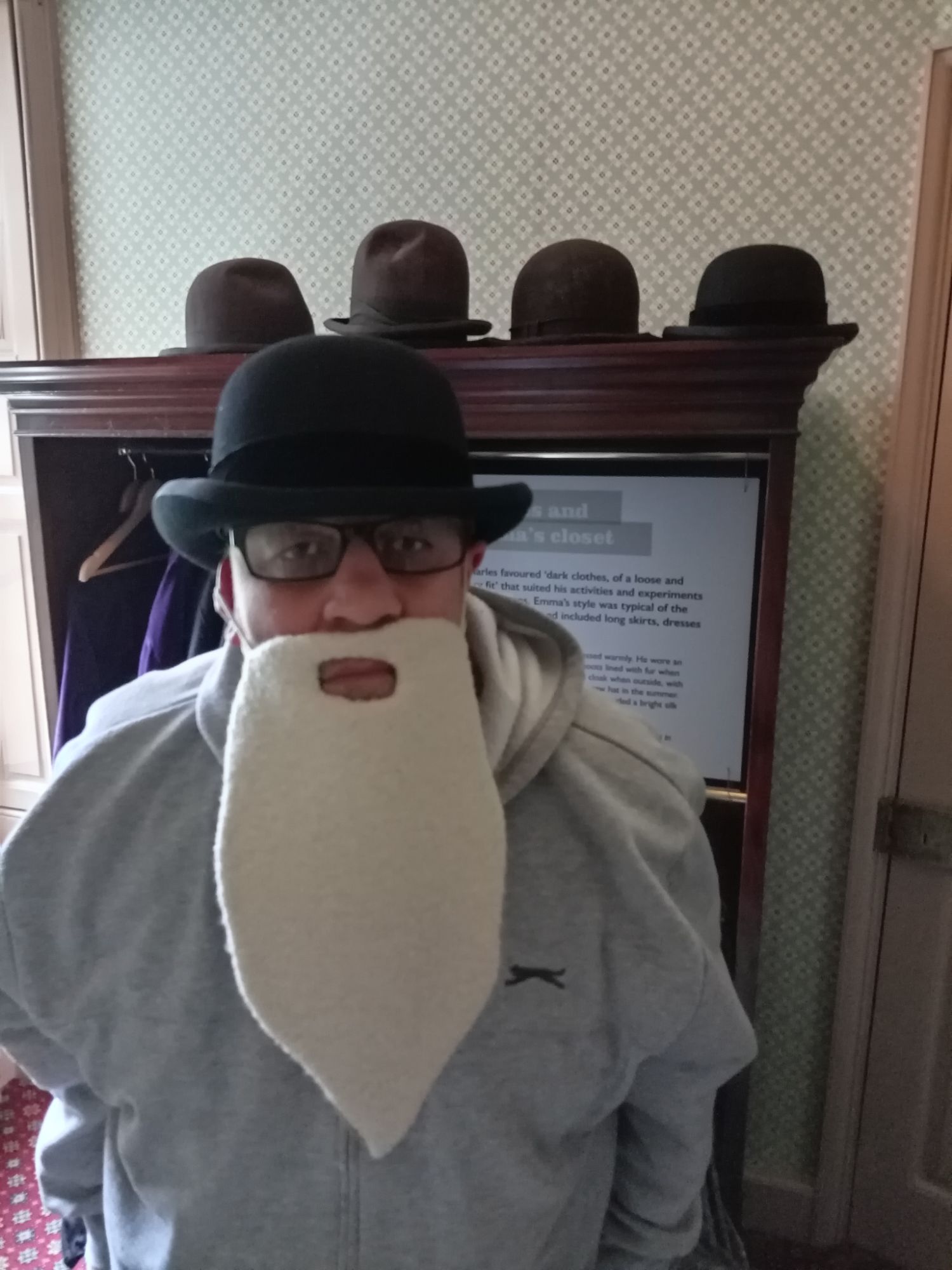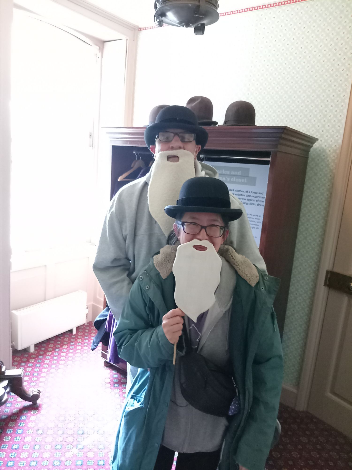 We have visited Down House many times in the past – as it is situated about an hour from where we live in Sutton. It is a beautiful manor house situated in Kent – with a large garden full of all the natural experiments Darwin developed over many decades – as he slowly but surely correlated the information he had gathered in his youth aboard the HMS Beagle. He further developed all this by closely observing how nature functioned and unfolded in his native England – realising that environmental conditions (natural selection) creates changes in living organisms so a to better enhance the chances of a) survival, and b) reproduction. Whether occurring in South America, the Pacific, or the UK, the evolutionary forces acted in exactly the same way. Of course, what is near at hand to each of us becomes the “familiar” – and what is far away becomes the “unfamiliar”. However, this is just a matter of sensory “immediacy” – the point that Darwin made is that there is a greater principle underlying it all that we, as individuals, must strive to appreciate and understand. As part of this process, myself, Ge, Mei-An, and Kai-Lin all donned bowler hats and fake beards – so that we could – even if only for a moment – become Vharles Darwin!
