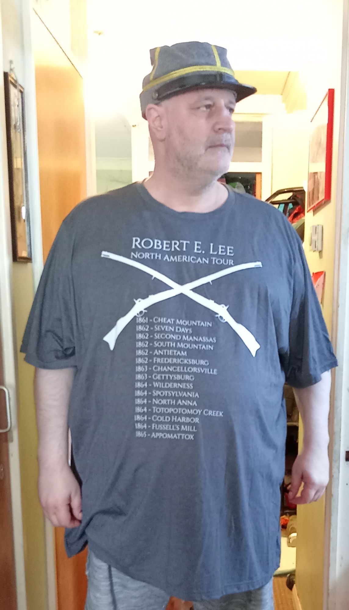 Every so often I receive gifts from Confederate Museums situated within Southern States – primarily for my articles covering the history of the Confederate States of America (1861-1865). Yesterday, I received a replica “kapi” hat with the rank of “Colonel” signified by the gold braid and Prussian-knot. I do not understand these ranks but assume that it has something to do with the German participation in the American Civil War. On top of this I am wearing a grey T-Shirt that humorously records all the battles fought by General Robert E Lee as he guided the Army of Northern Virginia in and out of the Northern (Federal) States. It is a historically accurate list with one or two battles I have not heard of before. The Confederate States is a fascinating time in US history and much of it is obscured and/or misrepresented. British military historians tend to be more level-headed about the reality of the Confederate States and the reasons it fought against the North.