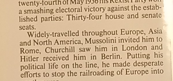 I attach the back dustcover to Leon Degrelle’s book entitled ‘Campaign in Russia – The Waffen SS on the Eastern Front’ (originally a French-language biography covering his time in the Belgian SS) – although the above reference is from the 1985 ‘English’ language rendition – published by the ‘Institute for Historical Review’. The back dustcover states that Degrelle met Churchill – implying that this meeting happened in 1936 (the same year Degrelle met Hitler).